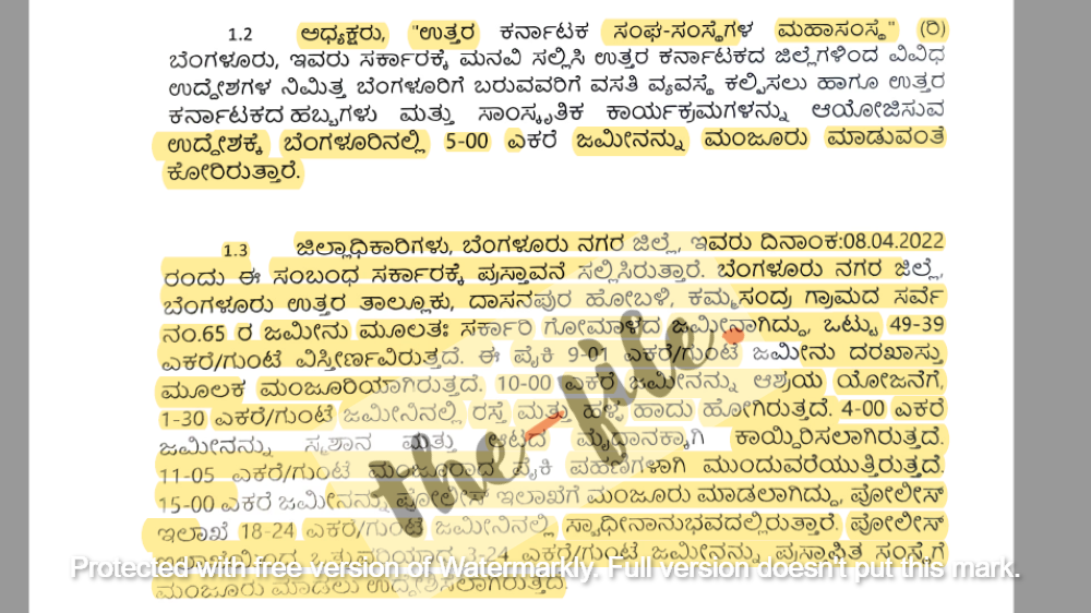 ಉತ್ತರ ಕರ್ನಾಟಕ ಜಿಲ್ಲೆಗಳಿಂದ ವಿವಿಧ ಉದ್ದೇಶಗಳಿಗಾಗಿ ಬೆಂಗಳೂರಿಗೆ ಬರುವವರಿಗಾಗಿ ವಸತಿ ವ್ಯವಸ್ಥೆ ಕಲ್ಪಿಸುವುದು ಮತ್ತು ಉತ್ತರ ಕರ್ನಾಟಕದ ಹಬ್ಬಗಳು, ಸಾಂಸ್ಕೃತಿಕ ಕಾರ್ಯಕ್ರಮಗಳನ್ನು ಆಯೋಜಿಸುವ ಉದ್ದೇಶದ ಹೆಸರಿನಲ್ಲಿ 3.24 ಎಕರೆ ವಿಸ್ತೀರ್ಣದ ಸರ್ಕಾರಿ ಗೋಮಾಳವನ್ನು ಹಂಚಿಕೆ ಮಾಡಿರುವುದು ಆದೇಶದಿಂದ ತಿಳಿದು ಬಂದಿದೆ.