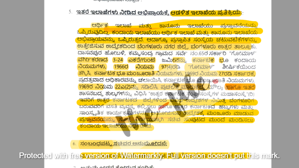 ಉತ್ತರ ಕರ್ನಾಟಕ ಸಂಘ ಸಂಸ್ಥೆಗಳ ಮಹಾ ಸಂಸ್ಥೆಗೆ 3.24 ಎಕರೆ ಗೋಮಾಳ ಜಮೀನು ಮಂಜೂರಾತಿಗೆ ಆರ್ಥಿಕ ಇಲಾಖೆಯೂ ಒಪ್ಪಿರಲಿಲ್ಲ. ‘ಆಡಳಿತ ಇಲಾಖೆಯ ಪ್ರಸ್ತಾವನೆಯನ್ನು ಪರಿಶೀಲಿಸಿದೆ. ಪ್ರಸ್ತಾವನೆಗೆ ಸಂಬಂಧಿಸಿದಂತೆ ಪ್ರಸ್ತಾಪಿತ ಸರ್ಕಾರಿ ಗೋಮಾಳ ಜಮೀನು ಬಿಬಿಎಂಪಿ ವ್ಯಾಪ್ತಿಯಿಂದ 10 ಕಿ ಮೀ ದೂರದಲ್ಲಿರುವುದರಿಂದ ಕರ್ನಾಟಕ ಭೂ ಮಂಜೂರಾತಿ ನಿಯಮಗಳು 1969ರ ನಿಯಮ 22(ಎ)2 ಅನ್ವಯ ನಗರ ಪೌರ ಸರಹದ್ದಿನೊಳಗೆ ಸರ್ಕಾರಿ ಜಮೀನುಗಳನ್ನು ಯಾವನೇ ವೈಯಕ್ತಿಕ ಅಥವಾ ಖಾಸಗಿ ಸಂಸ್ಥೆಗಳಿಗೆ ಮಂಜೂರು ಮಾಡಲು ಅವಕಾಶವಿರುವುದಿಲ್ಲವಾದದುರಿಂದ ಪ್ರಸ್ತಾವನೆಯನ್ನು ಒಪ್ಪಲು ಸಾಧ್ಯವಿಲ್ಲ,’ ಎಂದು ಆರ್ಥಿಕ ಇಲಾಖೆಯು 2022ರ ಜುಲೈ 22ರಂದೇ ಅಭಿಪ್ರಾಯಿಸಿತ್ತು. ಅದೇ ರೀತಿ ಕಾನೂನು ಇಲಾಖೆಯೂ ಸಹ ಈ ಪ್ರಸ್ತಾವನೆಯನ್ನು ತಿರಸ್ಕರಿಸಿತ್ತು.