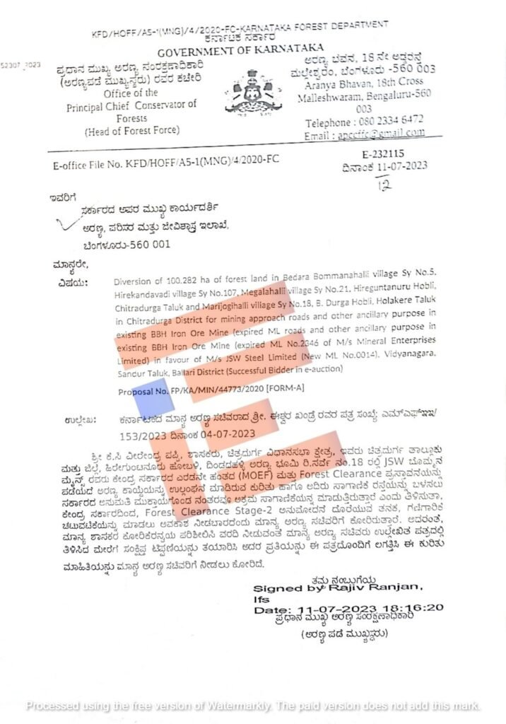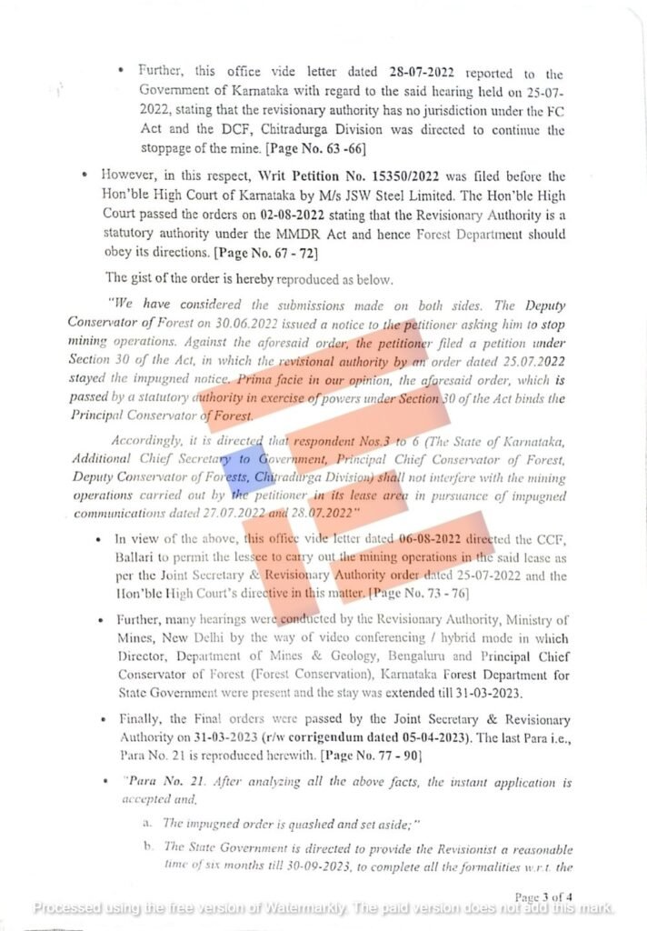 ನ್ಯಾಯಾಲಯದ ಆದೇಶದ ಅನ್ವಯ ಪತ್ರ ಮುಖೇನ ನಿರ್ದೇಶನ ನೀಡಿದ್ದ ಪಿಸಿಸಿಎಫ್ ಅವರು ಜಿಂದಾಲ್ ಕಂಪನಿಯ ಗಣೀಗಾರಿಕೆ ಮುಂದುವರೆಸಲು ಅವಕಾಶ ಮಾಡಿಕೊಡಬೇಕು ಎಂದು ಚಿತ್ರದುರ್ಗ ವಿಭಾಗದ ಡಿಸಿಎಫ್ ಅವರಿಗೆ 2022ರ ಆಗಸ್ಟ್ 6ರಂದು ಸೂಚಿಸಿದ್ದರು. ಅಲ್ಲದೇ ಹಲವು ವಿಚಾರಣೆಗಳನ್ನು ನಡೆಸಿದ್ದ ಪರಿಶೀಲನಾ ಪ್ರಾಧಿಕಾರವು 2023ರ ಮಾರ್ಚ್ 31ರಂದು ಅಂತಿಮ ಅದೇಶ ಹೊರಡಿಸಿತ್ತಲ್ಲದೇ ಡಿಸಿಎಫ್ ಅವರ ನಿಲುಗಡೆ ಆದೇಶವನ್ನು ರದ್ದುಮಾಡಿತ್ತು.
