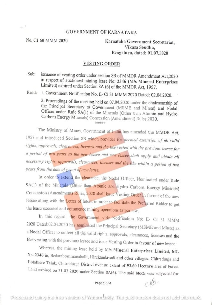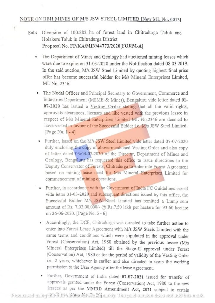 ಜೆ ಎಸ್ ಡಬ್ಲ್ಯೂ ಸ್ಟೀಲ್ಸ್ ಲಿಮಿಟೆಡ್ ಪರವಾಗಿ 2 ವರ್ಷಗಳ ಅವಧಿಗೆ “ಹಕ್ಕುಸ್ವಾಮ್ಯ ಆದೇಶ”ವನ್ನು (Vesting Order) 2020ರ ಜುಲೈ 1ರಂದು ಹೊರಡಿಸಲಾಗಿತ್ತು. ಈ ಹಕ್ಕುಸ್ವಾಮ್ಯ ಆದೇಶದ ನಂತರ ಗಣಿ ಮತ್ತು ಭೂವಿಜ್ಞಾನ ಇಲಾಖೆಯ ನಿರ್ದೇಶಕರು 2020ರ ಜುಲೈ 4ರಂದು ಪತ್ರವನ್ನು ನೀಡಿದ್ದರು. ಈ ಸಂಬಂಧ 2020ರ ಜುಲೈ 7ರಂದು ಕರ್ನಾಟಕ ಅರಣ್ಯ ಪಡೆಯ ಮುಖ್ಯಸ್ಥರಿಗೆ ಪತ್ರ ಬರೆದಿದ್ದ ಜೆಎಸ್ಡಬ್ಲ್ಯೂ ಕಂಪನಿಯು ಅದಿರು ಸಾಗಾಟ ಮಾಡಲು ಚಿತ್ರದುರ್ಗ ವಿಭಾಗದ ಉಪ ಅರಣ್ಯ ಸಂರಕ್ಷಣಾಧಿಕಾರಿಗೆ ನಿರ್ದೇಶಿಸಬೇಕು ಎಂದು ಕೋರಿದ್ದರು ಎಂಬುದು ವರದಿಯಿಂದ ಗೊತ್ತಾಗಿದೆ.