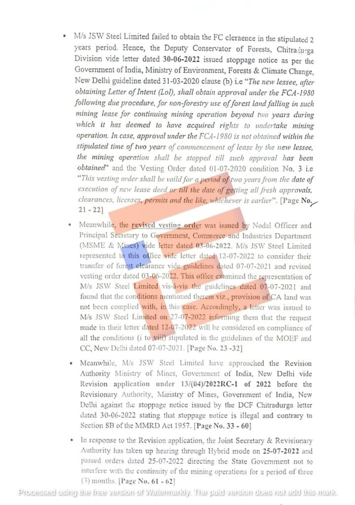 ಪ್ರಧಾನ ಅರಣ್ಯ ಮುಖ್ಯ ಸಂರಕ್ಷಣಾಧಿಕಾರಿಗಳು ಸಲ್ಲಿಸಿರುವ ವರದಿಯಲ್ಲಿ ಹಲವು ಮಹತ್ವದ ವಿಚಾರಗಳು ಬಹಿರಂಗವಾಗಿವೆ. ಗಣಿಗಾರಿಕೆ ಗುತ್ತಿಗೆ ಪಡೆದಿರುವ ಜೆ ಎಸ್ ಡಬ್ಲ್ಯು ಸ್ಟೀಲ್ ಲಿ. ಕಂಪನಿ, ಇಲ್ಲಿಯವರೆಗೆ ಹಕ್ಕುಸ್ವಾಮ್ಯ ಆದೇಶ (Vesting Order) ಪಡೆದು ಎರಡು ವರ್ಷ ಕಾಲಾವಕಾಶದ ಅವಧಿಯಲ್ಲಿ ಎಲ್ಲಾ ಅನುಮತಿಗಳನ್ನು ಪಡೆದಿಲ್ಲ ಮತ್ತು ಪ್ರಮುಖವಾಗಿ ಎರಡನೇ ಹಂತದ ಅನುಮತಿ ಪಡೆಯುವಲ್ಲಿ ವಿಫಲವಾಗಿತ್ತು ಎಂಬುದು ವರದಿಯಿಂದ ಗೊತ್ತಾಗಿದೆ.