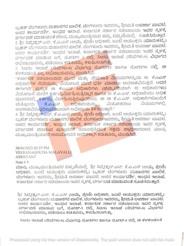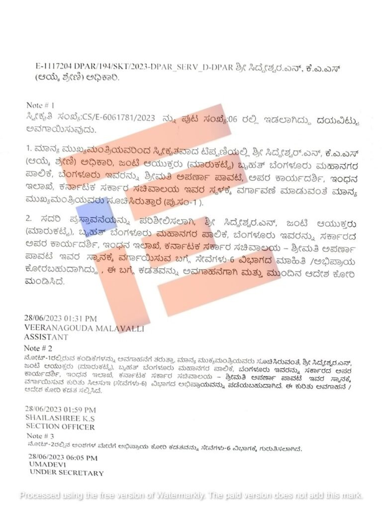 ಹೀಗಿದ್ದರೂ ಸಹ ಮುಖ್ಯಮಂತ್ರಿ ಸಿದ್ದರಾಮಯ್ಯ ಅವರು ಬಿಬಿಎಂಪಿಯ (ಮಾರುಕಟ್ಟೆ) ಜಂಟಿ ಆಯುಕ್ತರಾಗಿರುವ ಸಿದ್ದೇಶ್ವರ್‌ ಎನ್‌ ಅವರನ್ನು ಇಂಧನ ಇಲಾಖೆಯ ಅಪರ ಕಾರ್ಯದರ್ಶಿ ಸ್ಥಾನಕ್ಕೆ ವರ್ಗಾವಣೆ ಮಾಡಲು ಟಿಪ್ಪಣಿಯಲ್ಲಿ ಸೂಚಿಸಿರುವುದು ಟಿಪ್ಪಣಿ ಹಾಳೆಯಿಂದ ಗೊತ್ತಾಗಿದೆ.