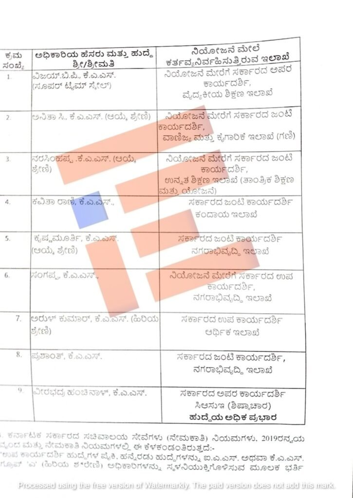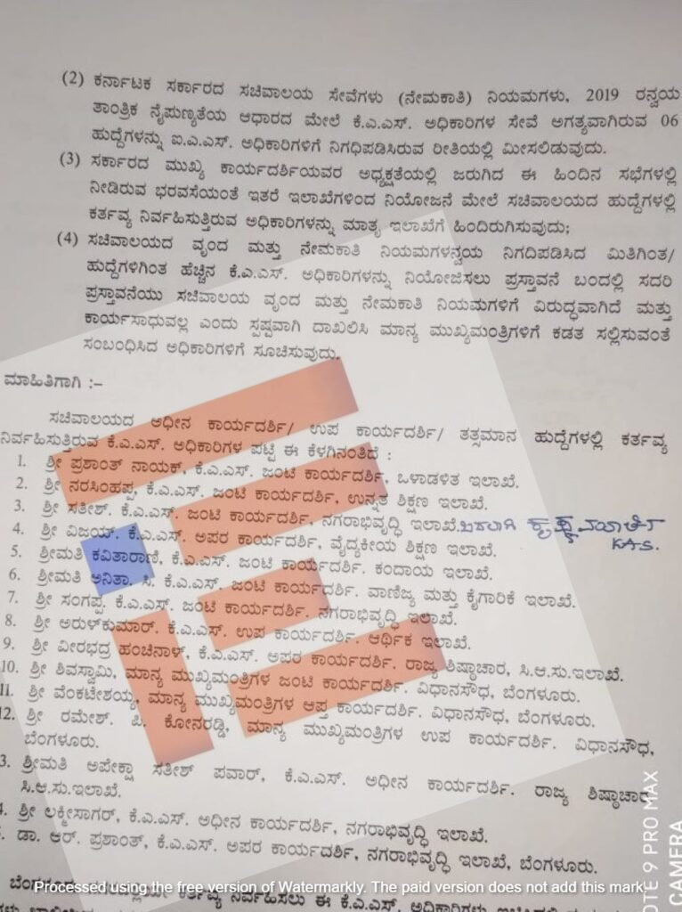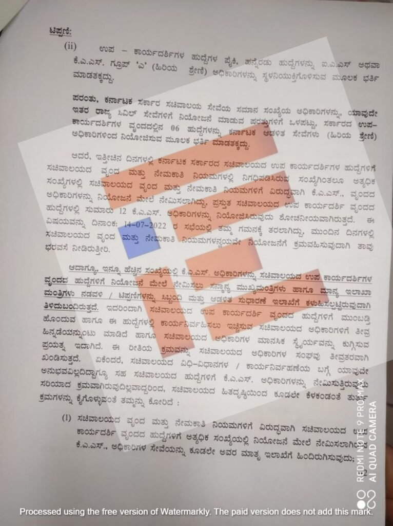 ಕರ್ನಾಟಕ ಸರ್ಕಾರದ ಸಚಿವಾಲಯದ ವೃಂದ ಮತ್ತು ನೇಮಕಾತಿ ನಿಯಮಗಳ ಅನ್ವಯ 06 ಕೆಎಎಸ್‌ ಅಧಿಕಾರಿಗಳ ಸೇವೆಯನ್ನು ನಿಯೋಜನೆ ಮಾಡಲು ಅವಕಾಶವಿದೆ. ಆದರೂ ಈ 6 ಅಧಿಕಾರಿಗಳ ಜತೆಯಲ್ಲಿಯೇ ಅರುಳ್‌ಕುಮಾರ್‌ (ಉಪ ಕಾರ್ಯದರ್ಶಿ, ಆರ್ಥಿಕ ಇಲಾಖೆ), ಪ್ರಶಾಂತ (ಜಂಟಿ ಕಾರ್ಯದರ್ಶಿ, ನಗರಾಭಿವೃದ್ಧಿ ), ವೀರಭದ್ರ ಹಂಚಿನಾಳ್‌ (ಶಿಷ್ಟಾಚಾರ, ಸರ್ಕಾರದ ಅಪರ ಕಾರ್ಯದರ್ಶಿ) ಕಾರ್ಯನಿರ್ವಹಿಸುತ್ತಿದ್ದರು.