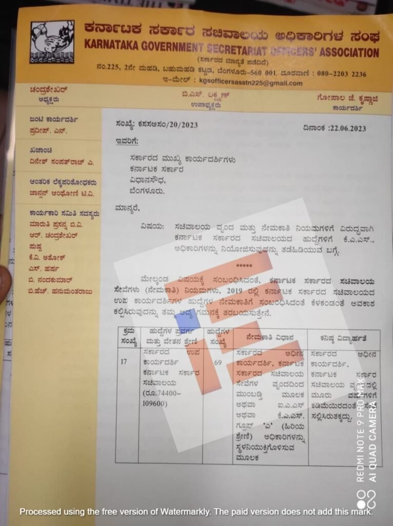ಸಚಿವಾಲಯಕ್ಕೆ ಕೆಎಎಸ್‌ ಅಧಿಕಾರಿಗಳ ನಿಯೋಜನೆಗೆ ವಿರೋಧ ವ್ಯಕ್ತಪಡಿಸಿದ್ದ ಸಚಿವಾಲಯ ಅಧಿಕಾರಿಗಳ ನೌಕರರ ಸಂಘವು 2023ರ ಜೂನ್‌ 22ರಂದು ಮುಖ್ಕಯ ಕಾರ್ಯಧರ್ಶಿಗೆ ದೂರು ಸಲ್ಲಿಸಿತ್ತು.