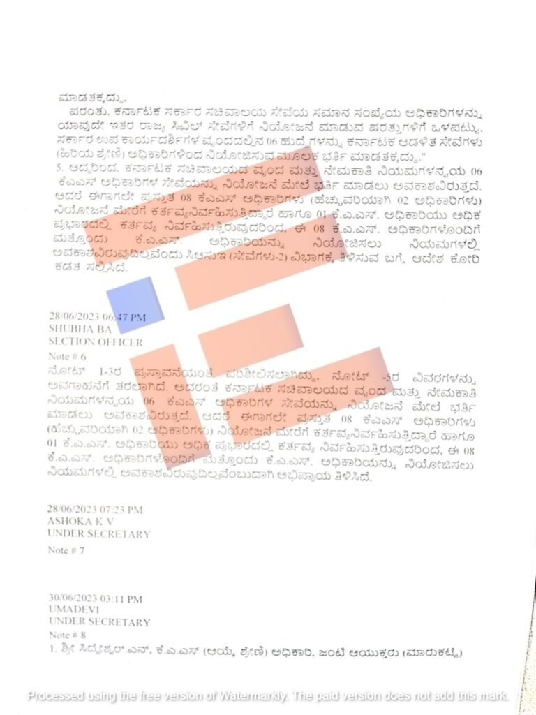 ಆದರೆ ಈಗಾಗಲೇ ಪ್ರಸ್ತುತ 8 ಕೆಎಎಸ್‌ ಅಧಿಕಾರಿಗಳು (ಹೆಚ್ಚುವರಿಯಾಗಿ 2 ಅಧಿಕಾರಿಗಳು) ನಿಯೋಜನೆ ಮೇರೆಗೆ ಕರ್ತವ್ಯ ನಿರ್ವಹಿಸುತ್ತಿದ್ದಾರೆ. ಹಾಗೂ 01 ಕೆಎಎಸ್‌ ಅಧಿಕಾರಿಯು ಅಧಿಕ ಪ್ರಭಾರದಲ್ಲಿ ಕರ್ತವ್ಯ ನಿರ್ವಹಿಸುತ್ತಿರುವುದರಿಂದ ಈ 08 ಕೆಎಎಸ್‌ ಅಧಿಕಾರಿಗಳೊಂದಿಗೆ ಮತ್ತೊಂದು ಕೆಎಎಸ್‌ ಅಧಿಕಾರಿಯನ್ನು ನಿಯೋಜಿಸಲು ನಿಯಮಗಳಲ್ಲಿ ಅವಕಾಶವಿರುವುದಿಲ್ಲ,’ ಎಂದು 2023ರ ಜೂನ್‌ 30ರಂದು ಅಭಿಪ್ರಾಯಿಸಿರುವುದು ಟಿಪ್ಪಣಿ ಹಾಳೆಯಿಂದ ತಿಳಿದು ಬಂದಿದೆ.