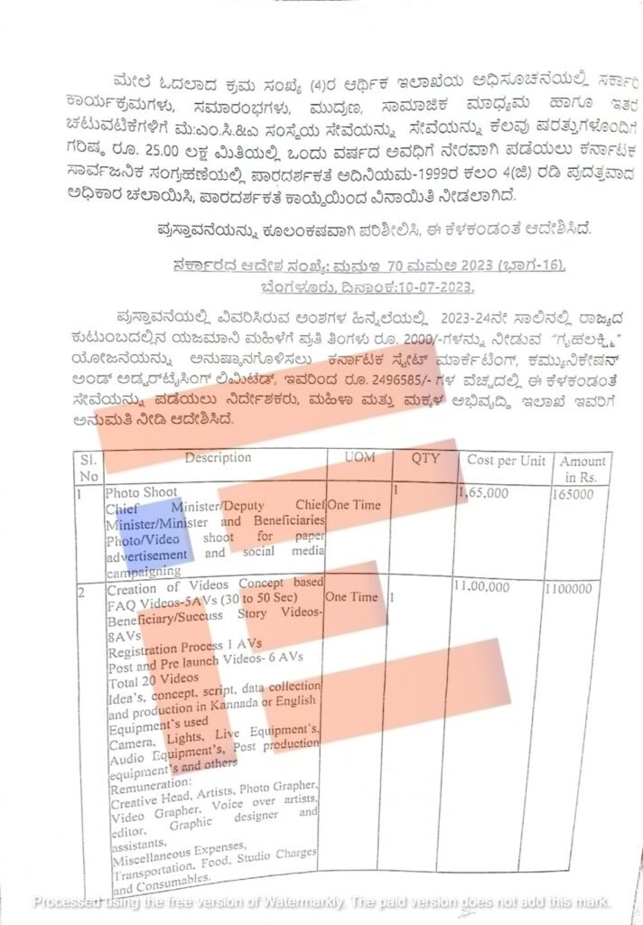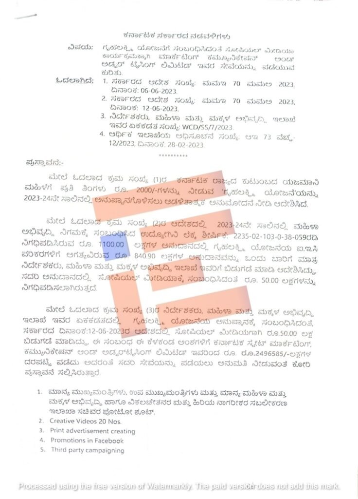 ‘ಗೃಹ ಲಕ್ಷ್ಮಿ ಯೋಜನೆ ಅನುಷ್ಠಾನಕ್ಕೆ ಸಂಬಂಧಿಸಿದಂತೆ 2023ರ ಜೂನ್ 12ರ ಆದೇಶದಲ್ಲಿ ಸೋಷಿಯಲ್ ಮೀಡಿಯಾಗಾಗಿ 50.00 ಲಕ್ಷ ಬಿಡುಗಡೆ ಮಾಡಿದ್ದು ಈ ಸಂಬಂಧ ಕರ್ನಾಟಕ ಸ್ಟೇಟ್ ಮಾರ್ಕೆಟಿಂಗ್ ಕಮ್ಯುನಿಕೇಷನ್ ಅಂಡ್ ಅಡ್ವರ್ಟೈಸಿಂಗ್ ಲಿಮಿಟೆಡ್ ನಿಂದ 24,96,585 ರು.ಗಳ ದರಪಟ್ಟಿ ಪಡೆದು ಸೇವೆ ಪಡೆಯಲು ಅನುಮತಿ ನೀಡಬೇಕು,’ ಎಂದು ಮಹಿಳಾ ಮತ್ತು ಮಕ್ಕಳ ಅಭಿವೃದ್ಧಿ ಇಲಾಖೆ ಪ್ರಸ್ತಾವನೆ ಸಲ್ಲಿಸಿತ್ತು.
