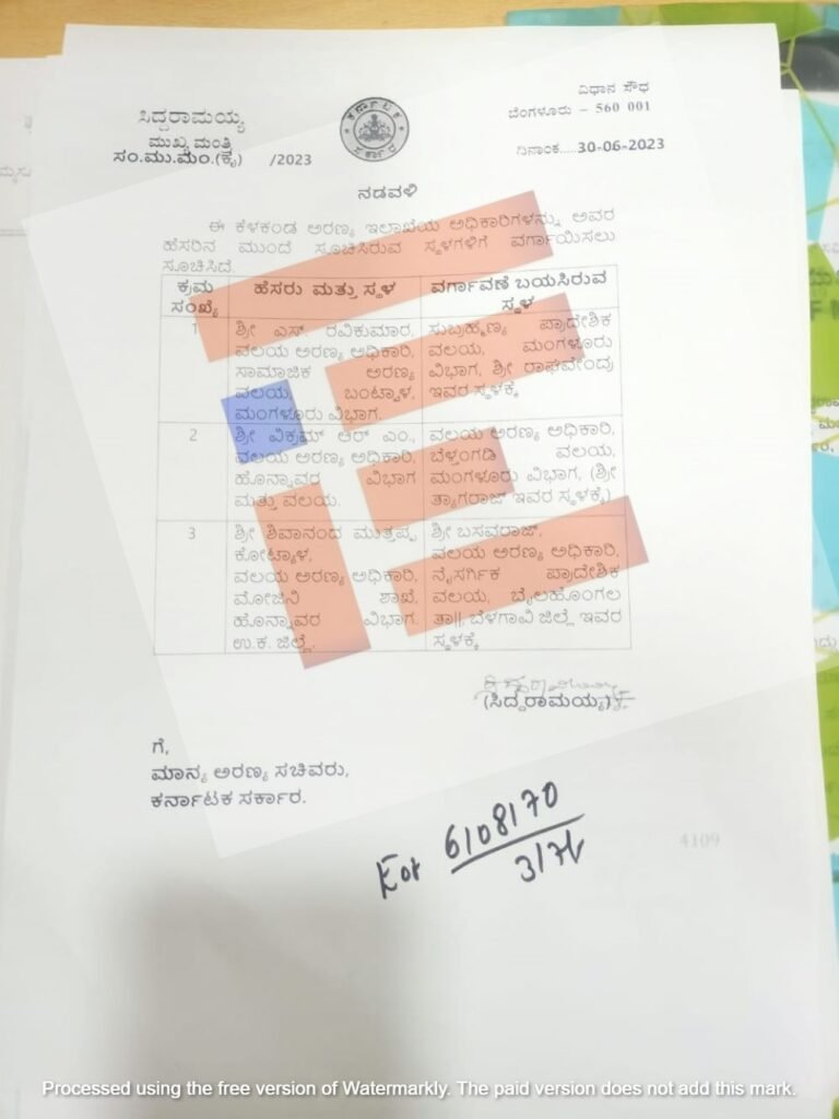 ಈ ಟಿಪ್ಪಣಿ ಹೊರಡಿಸಿದ 15 ದಿನದೊಳಗೇ ಮುಖ್ಯಮಂತ್ರಿ ಸಿದ್ದರಾಮಯ್ಯ ಅವರು ಬೆಳ್ತಂಗಡಿ ವಲಯ ಅರಣ್ಯಾಧಿಕಾರಿ ಹುದ್ದೆಗೆ ಹೊನ್ನಾವರ ವಿಭಾಗ ಮತ್ತು ವಲಯದಲ್ಲಿ ಅರಣ್ಯಾಧಿಕಾರಿಯಾಗಿ ಕಾರ್ಯನಿರ್ವಹಿಸುತ್ತಿದ್ದ ವಿಕ್ರಮ್ ಆರ್ ಎಂ ಅವರನ್ನು ವರ್ಗಾಯಿಸಬೇಕು ಎಂದು ಅರಣ್ಯ ಸಚಿವರಿಗೆ 2023ರ ಜೂನ್ 30ರಂದು ಸೂಚಿಸಿದ್ದಾರೆ.