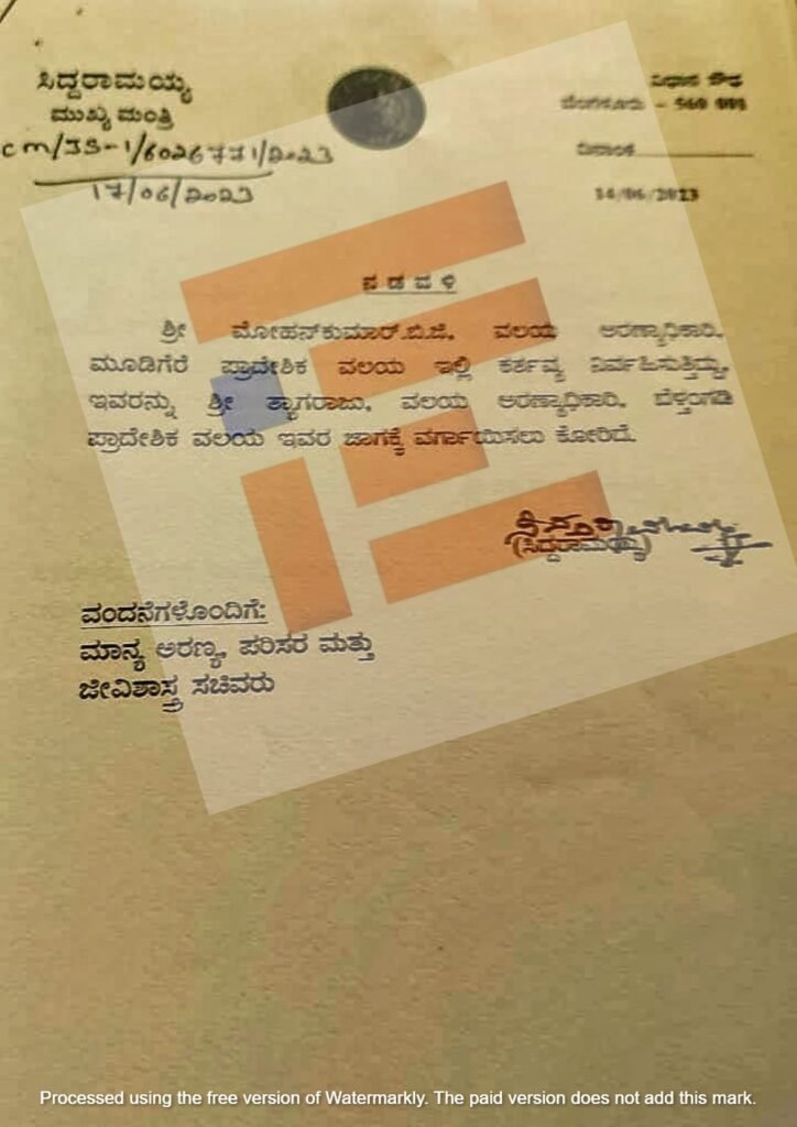 ಮೂಡಿಗೆರೆ ಪ್ರಾದೇಶಿಕ ವಲಯದಲ್ಲಿ ವಲಯ ಅರಣ್ಯಾಧಿಕಾರಿ ಹುದ್ದೆಯಲ್ಲಿ ಕಾರ್ಯನಿರ್ವಹಿಸುತ್ತಿದ್ದ ಬಿ ಜಿ ಮೋಹನ್ ಕುಮಾರ್ ಅವರನ್ನು ಬೆಳ್ತಂಗಡಿ ಪ್ರಾದೇಶಿಕ ವಲಯದಲ್ಲಿ ಕಾರ್ಯನಿರ್ವಹಿಸುತ್ತಿದ್ದ ತ್ಯಾಗರಾಜು ಅವರ ಜಾಗಕ್ಕೆ ವರ್ಗಾಯಿಸಲು ಕೋರಿದೆ ಎಂದು 2023ರ ಜೂನ್ 14ರಂದು ಸಿದ್ದರಾಮಯ್ಯ ಅವರು ಅರಣ್ಯ, ಪರಿಸರ ಮತ್ತು ಜೀವಿಶಾಸ್ತ್ರ ಇಲಾಖೆಯ ಸಚಿವ ಈಶ್ವರ್ ಖಂಡ್ರೆ ಅವರಿಗೆ ಟಿಪ್ಪಣಿ ಹೊರಡಿಸಿದ್ದರು.