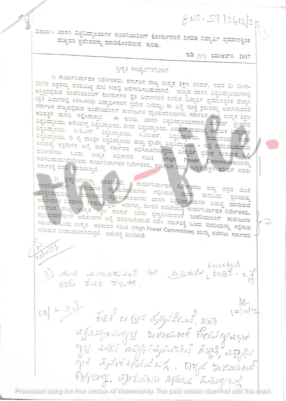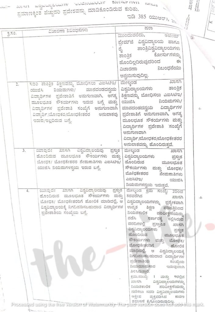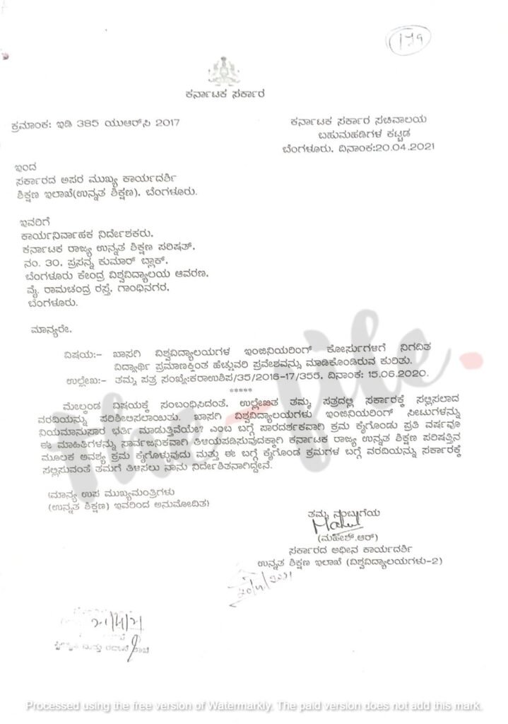 ‘ಖಾಸಗಿ ವಿಶ್ವವಿದ್ಯಾಲಯಗಳು ಇಂಜನಿಯರಿಂಗ್ ಸೀಟುಗಳನ್ನು ನಿಯಮಾನುಸಾರ ಭರ್ತಿ ಮಾಡುತ್ತಿವೆಯೇ ಎಂಬ ಬಗ್ಗೆ ಪಾರದರ್ಶಕವಾಗಿ ಕ್ರಮ ಕೈಗೊಂಡು ಪ್ರತಿ ವರ್ಷವೂ ಈ ಮಾಹಿತಿಗಳನ್ನು ಸಾರ್ವಜನಿಕವಾಗಿ ತಿಳಿಯಪಡಿಸುವುದಕ್ಕಾಗಿ ಕರ್ನಾಟಕ ರಾಜ್ಯ ಉನ್ನತ ಶಿಕ್ಷಣ ಪರಿಷತ್ನ ಮೂಲಕ ಅವಶ್ಯ ಕ್ರಮ ಕೈಗೊಳ್ಳುವುದು ಮತ್ತು ಈ ಬಗ್ಗೆ ಕೈಗೊಂಡ ಕ್ರಮಗಳ ವರದಿಯನ್ನು ಸರ್ಕಾರಕ್ಕೆ ಸಲ್ಲಿಸಬೇಕು,’ ಎಂದು ಉನ್ನತ ಶಿಕ್ಷಣ ಇಲಾಖೆಯ ಸರ್ಕಾರದ ಹೆಚ್ಚುವರಿ ಮುಖ್ಯ ಕಾರ್ಯದರ್ಶಿ 2021ರ ಏಪ್ರಿಲ್ 20ರಂದು ಉನ್ನತ ಶಿಕ್ಷಣ ಪರಿಷತ್ನ ಕಾರ್ಯನಿರ್ವಾಹಕ ನಿರ್ದೇಶಕರಿಗೆ ಪತ್ರ ಬರೆದಿದ್ದರು.