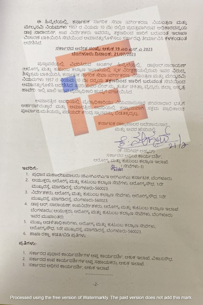 ಇದೇ ದೂರಿನಲ್ಲಿ ನಾಲ್ಕನೇ ಪ್ರತಿವಾದಿಯಾಗಿರುವ ಡಾ ನಾರಾಯಣ್ ಅವರನ್ನು ಚುನಾವಣೆ ಕರ್ತವ್ಯಕ್ಕೆ ವರದಿ ಮಾಡಿಕೊಂಡಿರಲಿಲ್ಲ ಎಂಬ ಕಾರಣವನ್ನು ಮುಂದೊಡ್ಡಿ ಆರೋಗ್ಯ ಮತ್ತು ಕುಟುಂಬ ಕಲ್ಯಾಣ ಇಲಾಖೆಯು ಅವರನ್ನು ಅಮಾನತುಗೊಳಿಸಿ ಆದೇಶಿಸಿದೆ. ಈ ಆದೇಶದ ಪ್ರತಿಯು ‘ದಿ ಫೈಲ್’ಗೆ ಲಭ್ಯವಾಗಿದೆ.