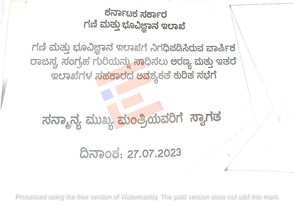 2023 ರ ಜುಲೈ 27ರ ಇಂದು ಮುಖ್ಯಮಂತ್ರಿ ಸಿದ್ದರಾಮಯ್ಯ ಅವರ ಉಪಸ್ಥಿತಿಯಲ್ಲಿ ನಡೆಯಲಿರುವ ಸಭೆಗೆ ಗಣಿ ಮತ್ತು ಭೂ ವಿಜ್ಞಾನ ಇಲಾಖೆಯು ವಾರ್ಷಿಕ ರಾಜಸ್ವ ಸಂಗ್ರಹ ಗುರಿಯನ್ನು ಸಾಧಿಸಲು 9,115.55 ಕೋಟಿ ಸಂಗ್ರಹ ಗುರಿಯ ಲೆಕ್ಕಾಚಾರವನ್ನು ಮಂಡಿಸಿದೆ.