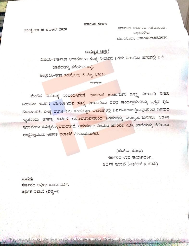 ‘ಸೂಕ್ಷ್ಮ ನೀರಾವರಿಯ ವಿವಿಧ ಕಾರ್ಯಕ್ರಮಗಳನ್ನು ಪ್ರಸ್ತುತ ಕೃಷಿ, ತೋಟಗಾರಿಕೆ, ರೇಷ್ಮೆ ಹಾಗೂ ಜಲ ಸಂಪನ್ಮೂಲ ಇಲಾಖೆಗಳಲ್ಲಿ ನಿರ್ವಹಿಸುತ್ತಿರುವುದರಿಂದ ನಿಗಮದ ಸ್ಥಾಪನೆಯು ಅನಗತ್ಯ ಖರ್ಚಿಗೆ ಕಾರಣವಾಗುವುದರಿಂದ ನಿಗಮವನ್ನು ಮುಕ್ತಾಯಗೊಳಿಸಲು ಆಡಳಿತ ಇಲಾಖೆ ಕ್ರಮಕೈಗೊಳ್ಳಬಹುದಾಗಿದೆ,’ ಎಂದು ಆರ್ಥಿಕ ಇಲಾಖೆಯ ಸರ್ಕಾರದ ಅಧೀನ ಕಾರ್ಯದರ್ಶಿ 2020ರ ಮೇ 29ರಂದು ಪತ್ರ ಬರೆದಿದ್ದರು. ಈ ಪತ್ರವನ್ನಾಧರಿಸಿ ‘ದಿ ಫೈಲ್’ ವರದಿ ಪ್ರಕಟಿಸಿತ್ತು.