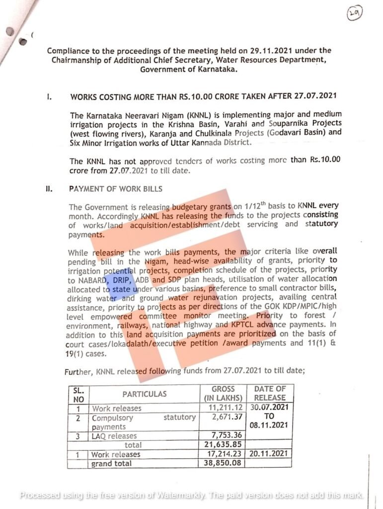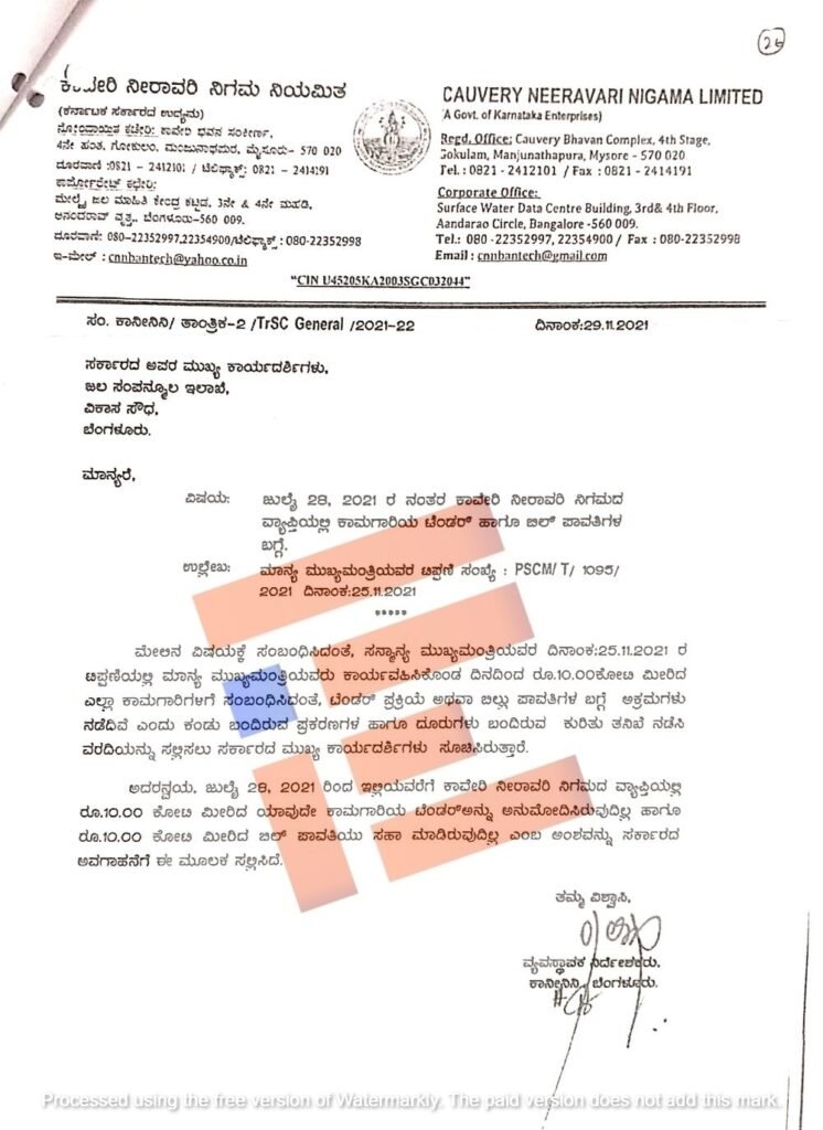 2021ರ ಜುಲೈ 28ರಿಂದ ಇಲ್ಲಿಯವರೆಗೆ ಕಾವೇರಿ ನೀರಾವರಿ ನಿಗಮದ ವ್ಯಾಪ್ತಿಯಲ್ಲಿ 10.00 ಕೋಟಿ ಮೀರಿದ ಯಾವುದೇ ಕಾಮಗಾರಿಯ ಟೆಂಡರ್‌ನ್ನು ಅನುಮೋದಿಸಿರುವುದಿಲ್ಲ. ಹಾಗೂ 10.00 ಕೋಟಿ ಮೀರಿದ ಬಿಲ್‌ ಪಾವತಿಯೂ ಸಹ ಮಾಡಿರುವುದಿಲ್ಲ ಎಂದು 2021ರ ನವೆಂಬರ್‌ 29ರಂದು ಮಾಹಿತಿ ಒದಗಿಸಿತ್ತು.
