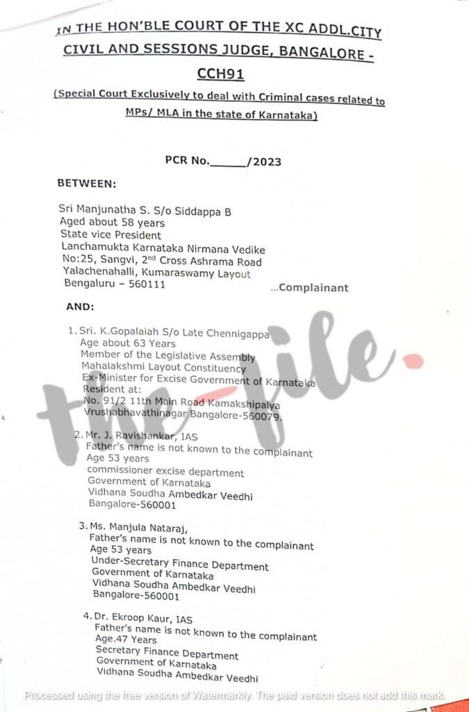 ಆದರೆ ಈ ದೂರನ್ನಾಧರಿಸಿ ಎಫ್ಐಆರ್ ದಾಖಲಿಸಿಕೊಂಡು ತನಿಖೆ ನಡೆಸಬೇಕಿದ್ದ ಲೋಕಾಯುಕ್ತ ಪೊಲೀಸರು ಯಾವುದೇ ಕ್ರಮಕೈಗೊಂಡಿರಲಿಲ್ಲ. ಹೀಗಾಗಿ ಲಂಚಮುಕ್ತ ಕರ್ನಾಟಕ ವೇದಿಕೆಯು ಜನಪ್ರತಿನಿಧಿಗಳ ನ್ಯಾಯಾಲಯದಲ್ಲಿ ಖಾಸಗಿ ದೂರು ದಾಖಲಿಸಿದ್ದರು. ಇಲಾಖೆಯ ಸಚಿವರಾಗಿದ್ದ ಕೆ ಗೋಪಾಲಯ್ಯ ಅವರನ್ನು ಮೊದಲ ಪ್ರತಿವಾದಿಯನ್ನಾಗಿ ಸಲ್ಲಿಸಿದ್ದ ಈ ದೂರನ್ನು ಅಂಗೀಕರಿಸಿರುವ ನ್ಯಾಯಾಲಯವು (P.C.R./0000021/2023) ಲೋಕಾಯುಕ್ತ ಎಸ್ಪಿಗೆ 2023ರ ಜೂನ್ 30ರಂದು ಸಮನ್ಸ್ ಜಾರಿಗೊಳಿಸಲಾಗಿದೆ.