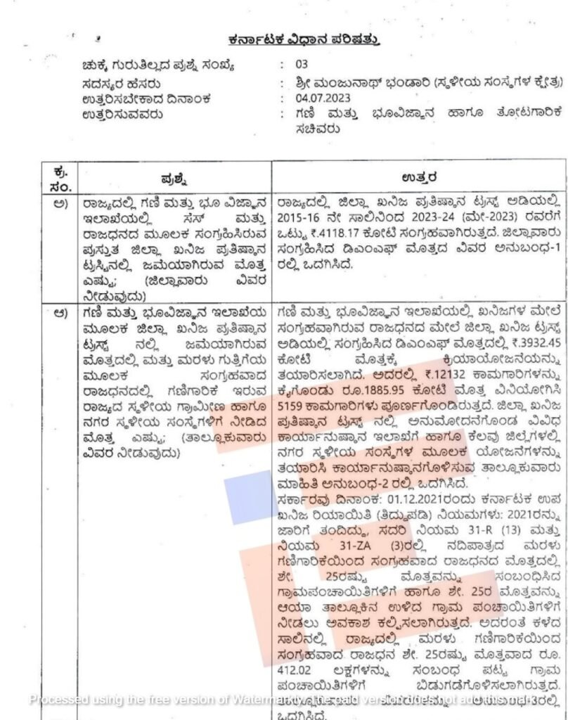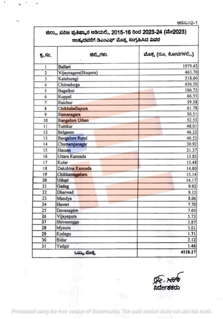 ಗಣಿ ಮತ್ತು ಭೂ ವಿಜ್ಞಾನ ಇಲಾಖೆಯಲ್ಲಿ ಖನಿಜಗಳ ಮೇಲೆ ಸಂಗ್ರಹವಾಗಿರುವ ರಾಜಧನದ ಮೇಲೆ ಜಿಲ್ಲಾ ಖನಿಜ ಟ್ರಸ್ಟ್ ಅಡಿಯಲ್ಲಿ ಸಂಗ್ರಹಿಸಿದ ಡಿಎಂಎಫ್ ಮೊತ್ತದಲ್ಲಿ 3,932.45 ಕೋಟಿ ರು. ಮೊತ್ತಕ್ಕೆ ಕ್ರಿಯಾ ಯೋಜನೆಯನ್ನು ತಯಾರಿಸಲಾಗಿದೆ. ಅದರಲ್ಲಿ 12,132 ಕಾಮಗಾರಿಗಳನ್ನು ಕೈಗೊಂಡು 1,885.95 ಕೋಟಿ ರು .ಮೊತ್ತ ವಿನಿಯೋಗಿಸಿ 5,159 ಕಾಮಗಾರಿಗಳು ಪೂರ್ಣಗೊಂಡಿರುವುದು ತಿಳಿದು ಬಂದಿದೆ.