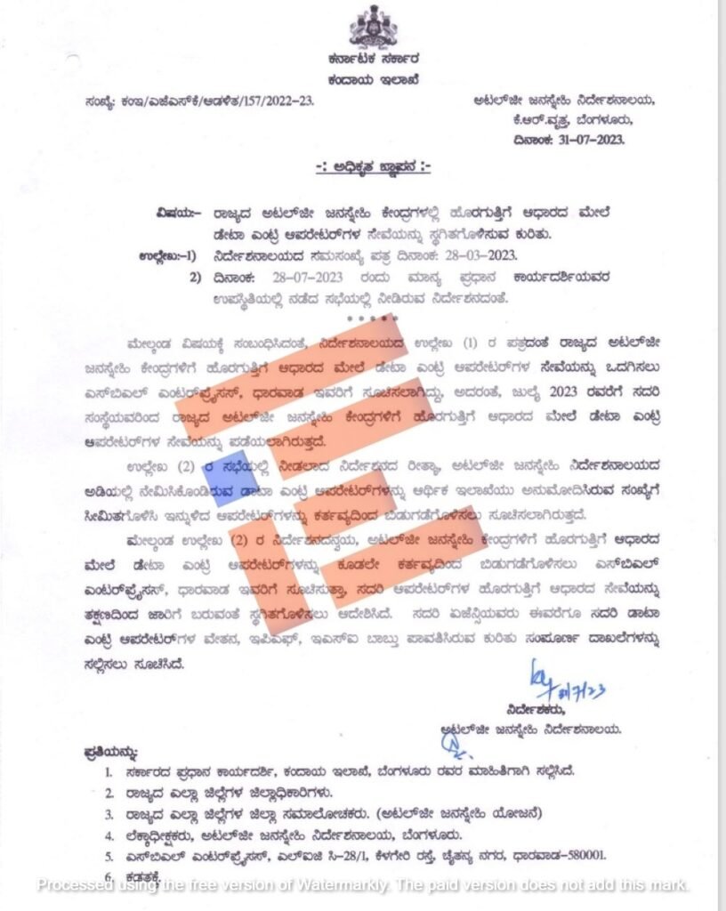 ಹೊರಗುತ್ತಿಗೆ ಅಡಿಯಲ್ಲಿ ಸೇವೆ ಸಲ್ಲಿಸುತ್ತಿರುವ ಡೇಟಾ ಆಪರೇಟರ್‍‌ಗಳನ್ನು 2023ರ ಜುಲೈ 28ರಂದು ನಡೆದ ಸಭೆಯಲ್ಲಿ ಪ್ರಧಾನ ಕಾರ್ಯದರ್ಶಿ ಅವರ ನಿರ್ದೇಶನದಂತೆ ಕೆಲಸದಿಂದ ಕಿತ್ತು ಹಾಕಲಾಗಿದೆ.’ಅಟಲ್‌ಜೀ ಜನಸ್ನೇಹಿ ನಿರ್ದೇಶನಾಲಯದ ಅಡಿಯಲ್ಲಿ ನೇಮಿಸಿಕೊಂಡಿರುವ ಡಾಟಾ ಎಂಟ್ರಿ ಆಪರೇಟರ್‍‌ಗಳನ್ನು ಆರ್ಥಿಕ ಇಲಾಖೆಯು ಅನುಮೋದಿಸಿರುವವ ಸಂಸ್ಥೆಗೆ ಸೀಮಿತಗೊಳಿಸಿ ಇನ್ನುಳಿದ ಆಪರೇಟರ್‍‌ಗಳನ್ನು ಕರ್ತವ್ಯದಿಂದ ಬಿಡುಗಡೆಗೊಳಿಸಲು ಸೂಚಿಸಲಾಗಿದೆ,’ ಎಂದು ನಿರ್ದೇಶಕರು 2023ರ ಜುಲೈ 31ರಂದು ಅಧಿಕೃತ ಜ್ಞಾಪನ ಪತ್ರ ಹೊರಡಿಸಿದ್ದಾರೆ. ಈ ಪತ್ರವು ‘ದಿ ಫೈಲ್‌’ಗೆ ಲಭ್ಯವಾಗಿದೆ.