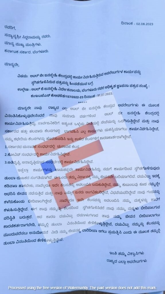 ಸಾರ್ವತ್ರಿಕ ಚುನಾವಣೆ, ಕೋವಿಡ್‌ ಸಂದರ್ಭ, ಅತಿವೃಷ್ಟಿ ಮತ್ತು ಅನಾವೃಷ್ಟಿಯಂತಹ ಸಂದರ್ಭಗಳಲ್ಲಿ ಅಟಲ್‌ ಜೀ ಜನಸ್ನೇಹಿ ಕೇಂದ್ರಗಳಲ್ಲಿ ಸಾವಿರಾರು ಸಂಖ್ಯೆಯಲ್ಲಿ ಡೇಟಾ ಎಂಟ್ರಿ ಆಪರೇಟರ್‍‌ಗಳು ಕಾರ್ಯನಿರ್ವಹಿಸುತ್ತಿದ್ದರು. ಆದರೀಗ ಕಾಂಗ್ರೆಸ್‌ ಸರ್ಕಾರವು ದಿಢೀರ್‍‌ ಎಂದು ಅವರ ಸೇವೆಯನ್ನು ಸ್ಥಗಿತಗೊಳಿಸಿ ಹೊರಡಿಸಿರುವ ಆದೇಶದಿಂದಾಗಿ ಅವರ ಬದುಕನ್ನು ಕಿತ್ತುಕೊಂಡತಾಗಿದೆ.