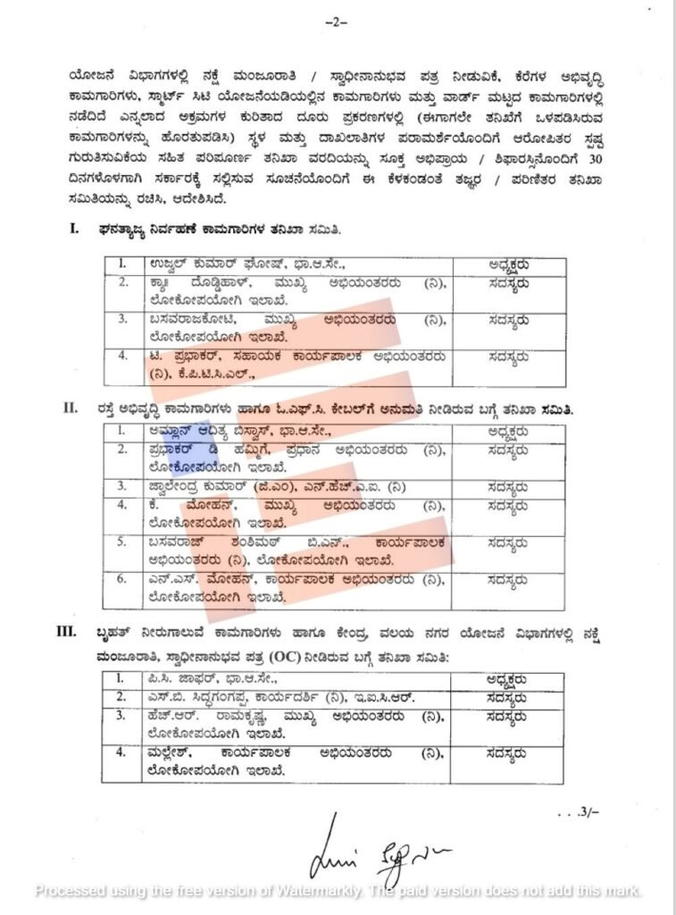 ಕೆರೆ ಅಭಿವೃದ್ಧಿ ಕಾಮಗಾರಿಗಳ/ಒಎಫ್‌ಸಿ ಅನುಮತಿ ಬಗ್ಗೆ ಐಎಎಸ್‌ ಅಧಿಕಾರಿ ಡಾ ವಿಶಾಲ್‌ ಆರ್‍‌, ಅಧ್ಯಕ್ಷತೆಯಲ್ಲಿ ತನಿಖಾ ಸಮಿತಿ ರಚಿಸಬೇಕು. ಈ ಸಮಿತಿಗೆ ನಿವೃತ್ತ ಕಾರ್ಯಪಾಲಕ ಇಂಜಿನಿಯರ್‍‌ಗಳಾದ ನಂಜಯ್ಯ, , ಹೆಚ್‌ ಪ್ರಕಾಶ್‌ರನ್ನು ಸದಸ್ಯರನ್ನಾಗಿ ನೇಮಿಸಬೇಕು ಎಂದು ಸೂಚಿಸಿರುವುದು ಟಿಪ್ಪಣಿಯಿಂದ ಗೊತ್ತಾಗಿದೆ.