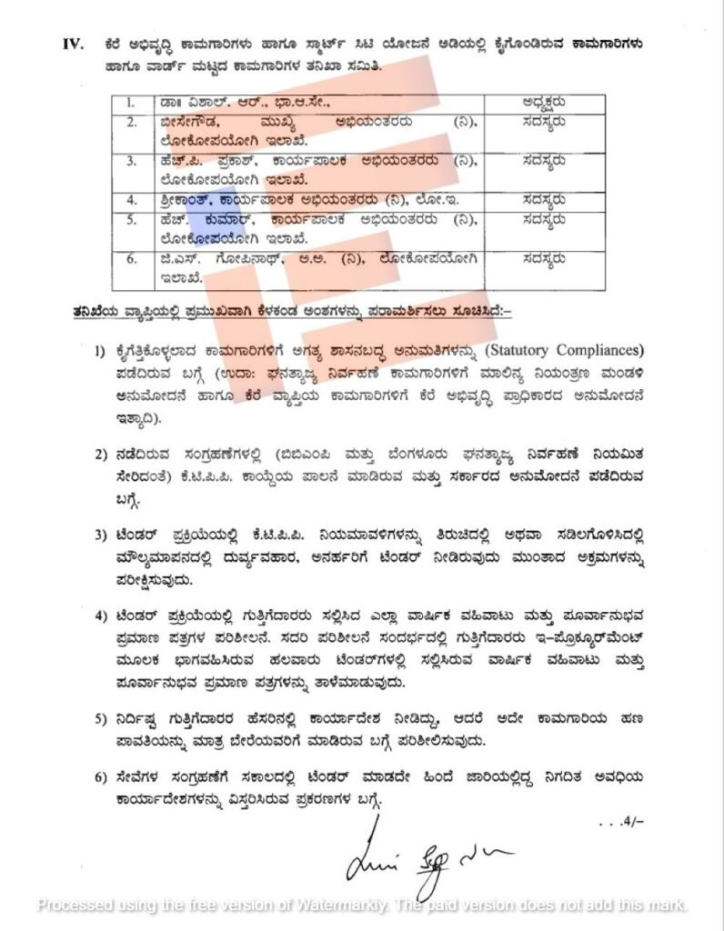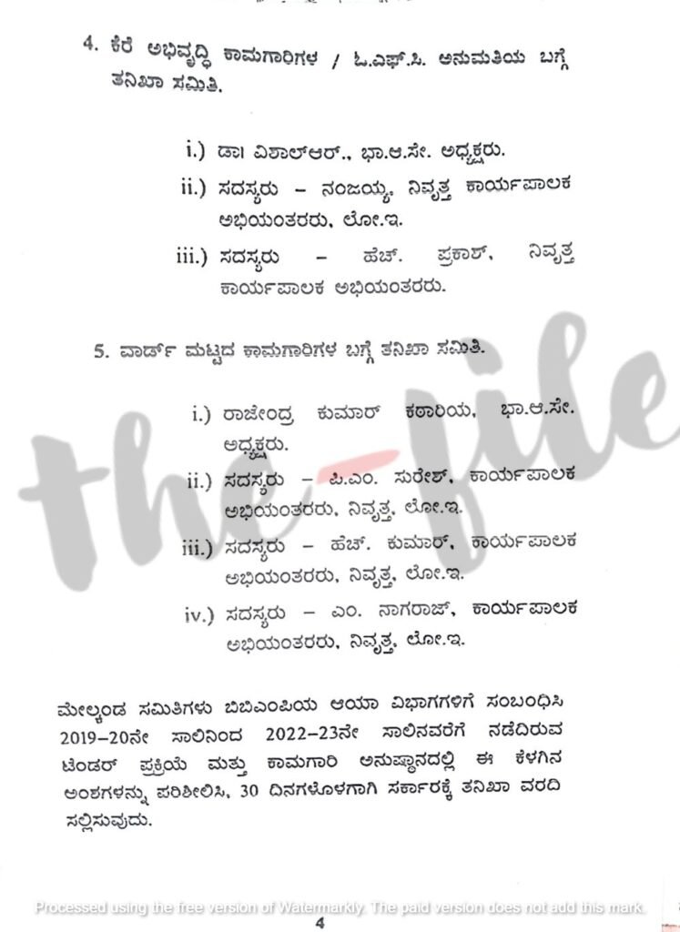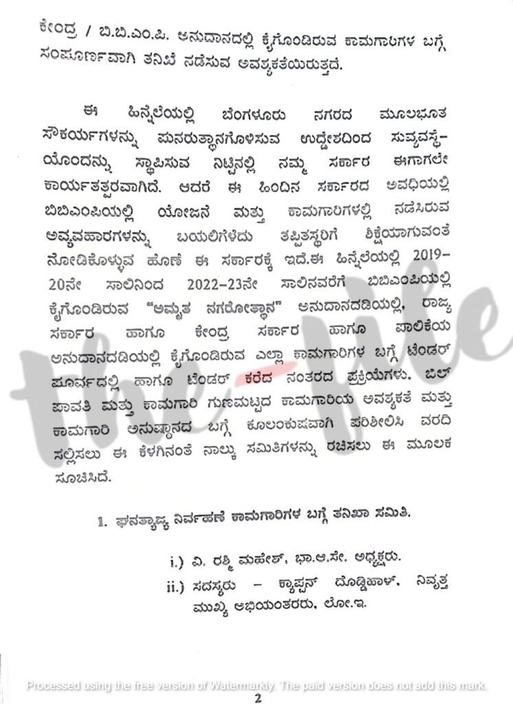 ವಾರ್ಡ್‌ ಮಟ್ಟದ ಕಾಮಗಾರಿಗಳ ಬಗ್ಗೆ ತನಿಖಾ ಸಮಿತಿಗೆ ಕಂದಾಯ ಇಲಾಖೆಯ ಸರ್ಕಾರದ ಪ್ರಧಾನ ಕಾರ್ಯದರ್ಶಿಯಾದ ರಾಜೇಂದರ್‍‌ ಕುಮಾರ್ ಕಟಾರಿಯಾ ಅವರನ್ನು ಅಧ್ಯಕ್ಷರನ್ನಾಗಿಸಬೇಕು. ಈ ಸಮಿತಿಗೆ ನಿವೃತ್ತ ಕಾರ್ಯಪಾಲಕ ಅಭಿಯಂತರರಾದ ಪಿ ಎಂ ಸುರೇಶ್‌, ಹೆಚ್‌ ಕುಮಾರ್‍‌ ಇವರನ್ನು ಸದಸ್ಯರನ್ನಾಗಿಸಬೇಕು ಎಂದು ಮೊದಲಿನ ಟಿಪ್ಪಣಿಯಲ್ಲಿ ಸೂಚಿಸಲಾಗಿತ್ತು.