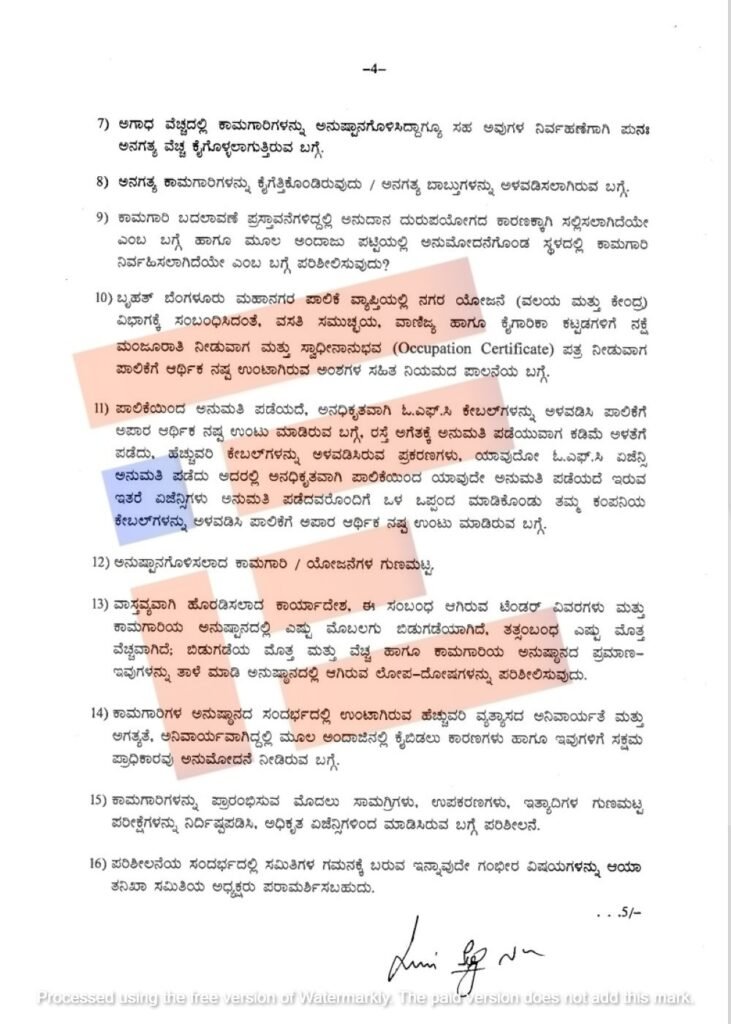 12. ಪಾಲಿಕೆಯಿಂದ ಅನುಮತಿ ಪಡೆಯದೇ ಅನಧಿಕೃತವಾಗಿ ಓಎಫ್‌ಸಿ ಕೇಬಲ್‌ಗಳನ್ನು ಅಳವಡಿಸಿ ಪಾಲಿಕೆಗೆ ಅಪಾರ ಆರ್ಥಿಕ ನಷ್ಟ ಉಂಟು ಮಾಡಿರುವ ಬಗ್ಗೆ, ರಸ್ತೆ ಅಗೆತಕ್ಕೆ ಅನುಮತಿ ಪಡೆಯುವಾಗ ಕಡಿಮೆ ಅಳತೆಗೆ ಪಡೆದು ಹೆಚ್ಚುವರಿ ಕೇಬಲ್‌ಗಳನ್ನು ಅಳವಡಿಸಿರುವ ಪ್ರಕರಣಗಳೂ, ಯಾವುದೋ ಓಎಫ್‌ಸಿ ಏಜೆನ್ಸಿ ಅನುಮತಿ ಪಡೆದು ಅದರಲ್ಲಿ ಅನಧಿಕೃತವಾಗಿ ಪಾಲಿಕೆಯಿಂದ ಯಾವುದೇ ಅನುಮತಿ ಪಡೆಯದೇ ಇರುವ ಇತರೆ ಏಜೆನ್ಸಿಗಳು ಅನುಮತಿ ಪೆದವರೊಂದಿಗೆ ಒಳ ಒಪ್ಪಂದ ಮಾಡಿಕೋಂಡು ತಮ್ಮ ಕಂಪನಿಯ ಕೇಬಲ್‌ಗಳನ್ನು ಅಳವಡಿಸಿ ಪಾಲಿಕೆಗೆ ಅಪಾರ ಆರ್ಥಿಕ ನಷ್ಟ ಉಂಟು ಮಾಡಿರುವ ಬಗ್ಗೆ