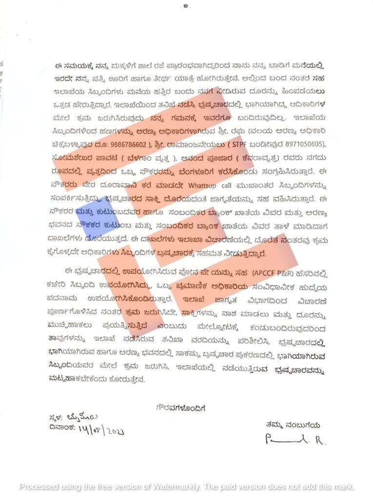 ವಲಯ ಅರಣ್ಯಾಧಿಕಾರಿ ಹುದ್ದೆಯ ಮುಂಬಡ್ತಿ ಆದೇಶ ಹೊರಡಿಸಲು ಅಪರ ಪ್ರಧಾನ ಮುಖ್ಯ ಅರಣ್ಯ ಸಂರಕ್ಷಣಾಧಿಕಾರಿ ಕಚೇರಿ ಸಿಬ್ಬಂದಿಗಳಾದ ರಾಜೇಶ, ಇರೇಗಾಡ, ಹನುಂತಪ್ಪ ಮತ್ತು ಸೌಜನ್ಯ ಎಂಬುವರು ತಲಾ 4 ಲಕ್ಷ ರು. ಹಣ ಸಂದಾಯ ಮಾಡಬೇಕು ಎಂದು ಬೇಡಿಕೆ ಇರಿಸುತ್ತಿದ್ದಾರೆ ಎಂದು ಮೈಸೂರು ಮೂಲದ ಪ್ರಕಾಶ್ ಎಂಬುವರು 2023ರ ಮಾರ್ಚ್ 29ರಂದು ಮೊದಲು ದೂರರ್ಜಿ ಸಲ್ಲಿಸಿದ್ದರು. ಇದಾದ ನಂತರವೂ 2023ರ ಜೂನ್ 7ರಂದು ದೂರು ಎರಡನೇ ದೂರರ್ಜಿ ಸಲ್ಲಿಸಿರುವುದು ಗೊತ್ತಾಗಿದೆ.