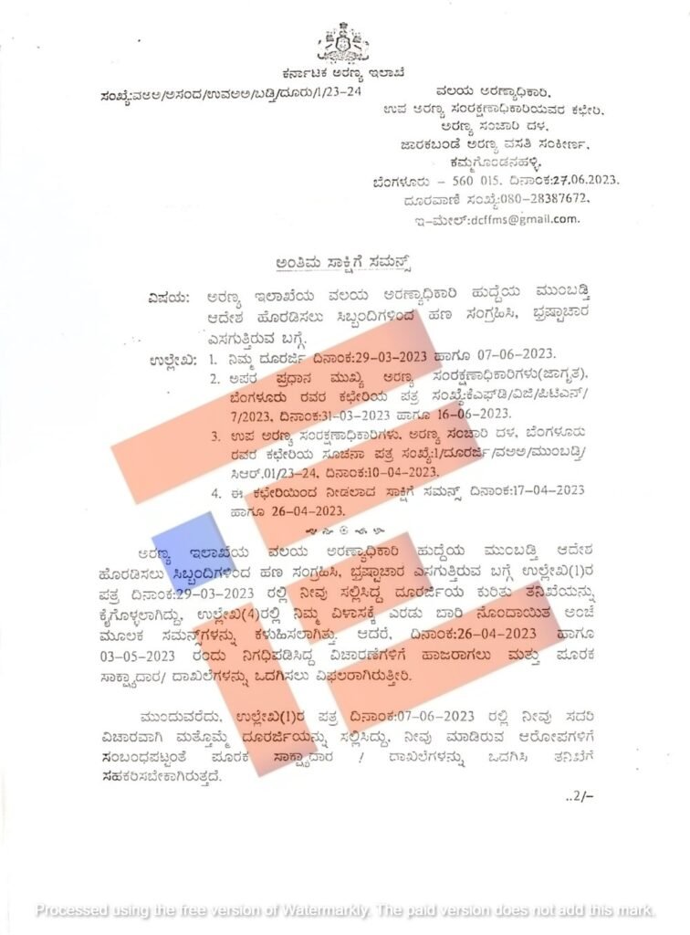 ಈ ದೂರನ್ನು ಪರಿಶೀಲಿಸಿರುವ ಅರಣ್ಯ ಸಂಚಾರಿ ದಳದ ತನಿಖಾಧಿಕಾರಿ ಮತ್ತು ವಲಯ ಅರಣ್ಯಾಧಿಕಾರಿ ವರುಣ್ ಕುಮಾರ್ ಎಂಬುವರು ದೂರುದಾರನಿಗೆ 2023ರ ಜೂನ್ 27ರಂದು ಸಮನ್ಸ್ ಜಾರಿಗೊಳಿಸಿದ್ದಾರೆ. ದೂರು ಮತ್ತು ಸಮನ್ಸ್ ಪ್ರತಿಯು ‘ದಿ ಫೈಲ್’ಗೆ ಲಭ್ಯವಾಗಿದೆ.
