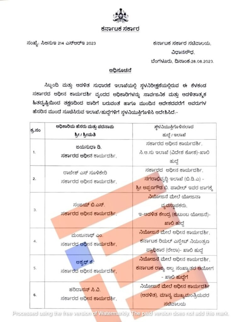 ದಾವಣಗೆರೆ ಮಹಾನಗರಪಾಲಿಕೆಯಲ್ಲಿ ಉಪ ಆಯುಕ್ತರಾಗಿ ಕಾರ್ಯನಿರ್ವಹಿಸುತ್ತಿದ್ದ ಕೆ ಆರ್ ಶ್ರೀನಿವಾಸ ಅವರನ್ನು ಸಿಬ್ಬಂದಿ ಮತ್ತು ಆಡಳಿತ ಸುಧಾರಣೆ ಇಲಾಖೆಯು ಮುಖ್ಯಮಂತ್ರಿ ಸಚಿವಾಲಯದ ಅಧೀನ ಕಾರ್ಯದರ್ಶಿ ಹುದ್ದೆಗೆ 2023ರ ಜುಲೈ 15ರಂದು ನೇಮಿಸಿ ಅಧಿಸೂಚನೆ ಹೊರಡಿಸಿತ್ತು.