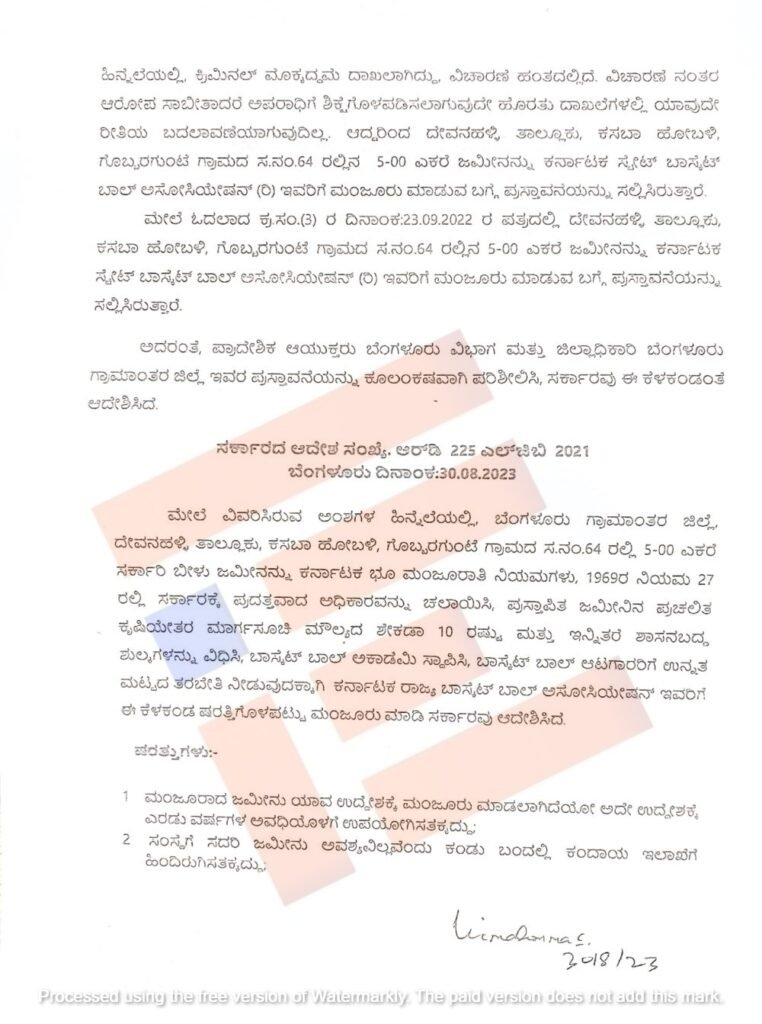 ಬೆಂಗಳೂರು ಗ್ರಾಮಾಂತರ ಜಿಲ್ಲೆ ದೇವನಹಳ್ಳಿ ತಾಲೂಕು ಕಸಬಾ ಹೋಬಳಿ ಗೊಬ್ಬರಗುಂಟೆ ಗ್ರಾಮದ ಸ ನಂ 64ರ 5 ಎಕರೆ ಸರ್ಕಾರಿ ಬೀಳು ಜಮೀನನ್ನು ಬ್ಯಾಸ್ಕೆಟ್ ಬಾಲ್ ಅಕಾಡೆಮಿ ಸ್ಥಾಪಿಸಲು ಕರ್ನಾಟಕ ಭೂ ಮಂಜೂರಾತಿ ನಿಯಮಗಳು 1969ರ ನಿಯಮ 27ರ ಪ್ರಕಾರ ಜಮೀನಿನ ಕೃಷಿಯೇತರ ಪ್ರಚಲಿತ ಮಾರುಕಟ್ಟೆ ಮೌಲ್ಯ ಮತ್ತು ಇನ್ನಿತರೆ ಶಾಸನಬದ್ಧ ಶುಲ್ಕಗಳನ್ನು ವಿಧಿಸಿ ಮಂಜೂರು ಮಾಡುವ ಪ್ರಸ್ತಾವನೆಯನ್ನು ಸಚಿವ ಸಂಪುಟದ ಸೂಕ್ತ ನಿರ್ಣಯಕ್ಕೆ ಮಂಡಿಸಿತ್ತು ಎಂಬುದು ಸಚಿವ ಸಂಪುಟ ಟಿಪ್ಪಣಿ ಹಾಳೆಯಿಂದ ಗೊತ್ತಾಗಿದೆ.