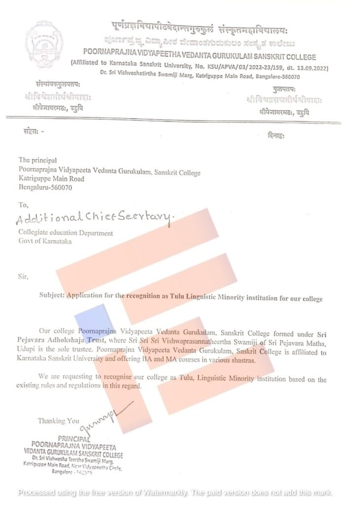 ಸಾಂವಿಧಾನಿಕ ಮಾನ್ಯತೆ ಇಲ್ಲದೆ, ಸರಕಾರದ ಪ್ರೋತ್ಸಾಹವಿಲ್ಲದೆ, ಅಲ್ಪಸಂಖ್ಯಾತರ ಭಾಷೆಯಾಗಿ ಉಳಿದು ತುಳು ಭಾಷೆ ನಲುಗಿದೆ. ತುಳು ಭಾಷೆಗೆ ಎರಡನೆ ಅಧಿಕೃತ ಭಾಷೆಯ ಸ್ಥಾನಮಾನ ನೀಡಬೇಕು ಎಂದು ತುಳು ಭಾಷಿಕರು ಒತ್ತಾಯ ಮಾಡುತ್ತಿರುವವ ನಡುವೆಯೇ ಪೂರ್ಣ ಪ್ರಜ್ಞ ವಿದ್ಯಾಪೀಠದ ಸಂಸ್ಕೃತ ಕಾಲೇಜು ಪ್ರಾಂಶುಪಾಲರು ಬರೆದಿರುವ ಈ ಪತ್ರವು ಮುನ್ನೆಲೆಗೆ ಬಂದಿದೆ. ಈ ಪತ್ರದ ಪ್ರತಿಯು ‘ದಿ ಫೈಲ್’ಗೆ ಲಭ್ಯವಾಗಿದೆ.