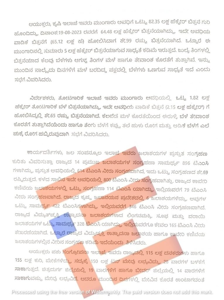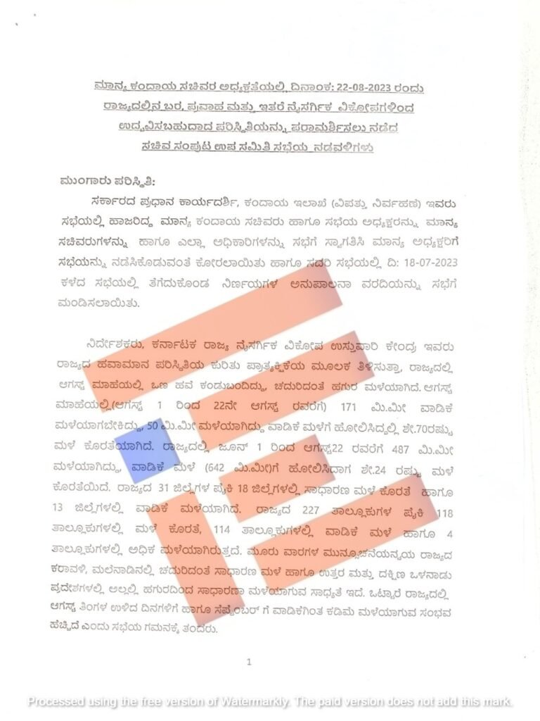 ಕಂದಾಯ ಸಚಿವ ಕೃಷ್ಣ ಬೈರೇಗೌಡ ಅವರ ಅಧ್ಯಕ್ಷತೆಯಲ್ಲಿ 2023ರ ಆಗಸ್ಟ್ 22ರಂದು ನಡೆದಿದ್ದ ಸಚಿವ ಸಂಪುಟ ಉಪ ಸಮಿತಿ ಸಭೆಯಲ್ಲಿ ಮಳೆ ಕೊರತೆ ಅಂಕಿ ಅಂಶಗಳನ್ನು ಕೆಎಸ್ಎನ್ಎಂಡಿಸಿ ಮಂಡಿಸಿರುವುದು ಗೊತ್ತಾಗಿದೆ. ಸಭೆಯ ನಡವಳಿಗಳು ‘ದಿ ಫೈಲ್’ಗೆ ಲಭ್ಯವಾಗಿವೆ.