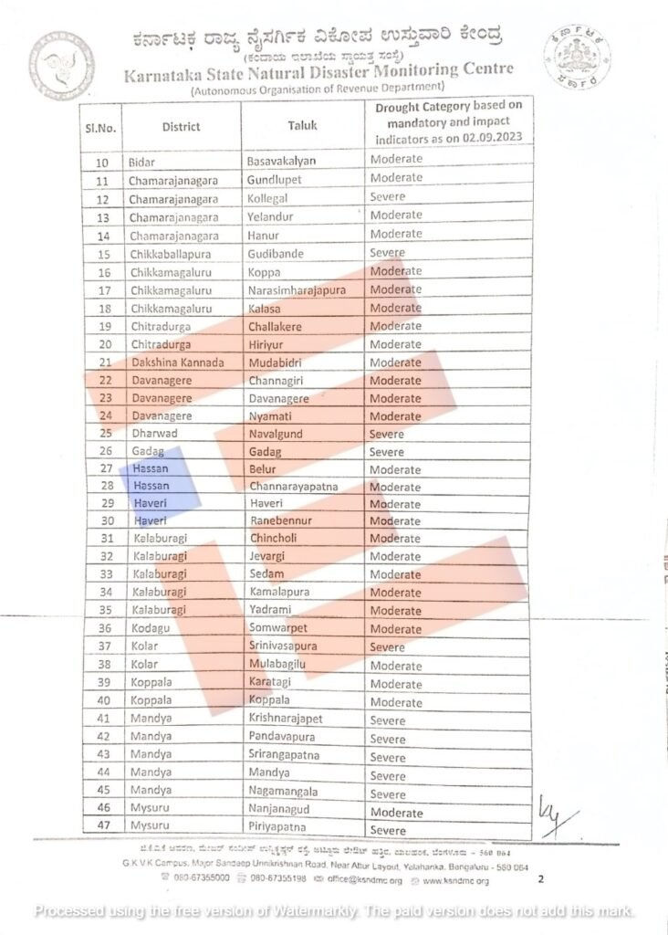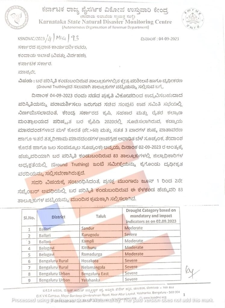ಬರ ಪರಿಸ್ಥಿತಿ ಕಂಡು ಬಂದಿರುವ ತಾಲೂಕುಗಳಲ್ಲಿ ಕ್ಷೇತ್ರ ಪರಿಶೀಲನೆ ಹಾಗೂ ದೃಢೀಕರಣ ಸಲುವಾಗಿ ತಾಲೂಕುಗಳ ಪಟ್ಟಿಯನ್ನು ಕರ್ನಾಟಕ ನೈಸರ್ಗಿಕ ವಿಕೋಪ ಉಸ್ತುವಾರಿ ಕೇಂದ್ರವು (ಕೆಎಸ್ಎನ್ಡಿಎಂಸಿ) ಕಂದಾಯ ಇಲಾಖೆಯ ಸರ್ಕಾರದ ಪ್ರಧಾನ ಕಾರ್ಯದರ್ಶಿಗೆ ಒದಗಿಸಿದೆ. ಈ ಪಟ್ಟಿಯು ‘ದಿ ಫೈಲ್’ಗೆ ಲಭ್ಯವಾಗಿದೆ.