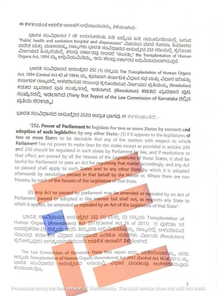 ಕರ್ನಾಟಕ ಕಾನೂನು ಆಯೋಗದ 31ನೇ ವರದಿ ಪರಿಶೀಲಿಸಿದ್ದು ವರದಿ ಅನ್ವಯ ‘ಮಾನವ ಅಂಗಗಳ ಕಸಿ (ತಿದ್ದುಪಡಿ) ಕಾಯಿದೆ (Transplantation of Human Organs (Amendment) Act 2011 (Central Act 16 of 2011) ಭಾರತ ಸಂವಿಧಾನದ ಅನುಚ್ಛೇದದ ಅಡಿಯಲ್ಲಿ ವಿಧಾನ ಮಂಡಲವು ಅಂಗೀಕರಿಸಿರುವುದು ಕಂಡು ಬರುತ್ತಿಲ್ಲ,’ ಎಂದು ಸಂಸದೀಯ ವ್ಯವಹಾರಗಳ ಇಲಾಖೆಯು ಆರೋಗ್ಯ ಮತ್ತು ಕುಟುಂಬ ಕಲ್ಯಾಣ ಇಲಾಖೆಗೆ ತಿಳಿಸಿರುವುದು ಗೊತ್ತಾಗಿದೆ.