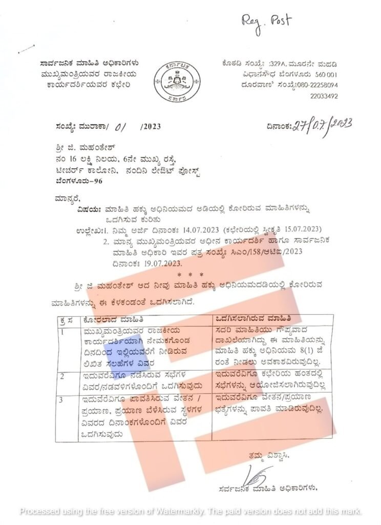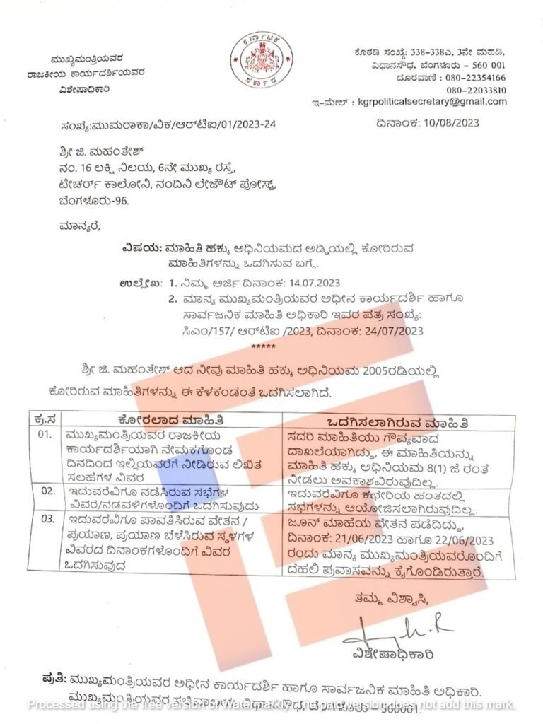 ಈ ಮಾಹಿತಿಗೆ ಹಿಂಬರಹ ನೀಡಿರುವ ಡಾ ಕೆ ಗೋವಿಂದರಾಜು ಅವರ ಕಛೇರಿಯ ವಿಶೇಷಾಧಿಕಾರಿ ‘ಸದರಿ ಮಾಹಿತಿಯು ಗೌಪ್ಯವಾದ ದಾಖಲೆಯಾಗಿದ್ದು, ಈ ಮಾಹಿತಿಯನ್ನು ಮಾಹಿತಿ ಹಕ್ಕು ಅಧಿನಿಯಮ 8(1) ಜೆ ರಂತೆ ನೀಡಲು ಅವಕಾಶವಿರುವುದಿಲ್ಲ. ಇದುವರೆವಿಗೂ ಕಚೇರಿ ಹಂತದಲ್ಲಿ ಸಭೆಗಳನ್ನು ಆಯೋಜಿಸಿರುವುದಿಲ್ಲ. ಜೂನ್‌ ಮಾಹೆಯ ವೇತನ ಪಡೆದಿದ್ದು 2023ರ ಜೂನ್‌ 21 ಹಾಗೂ ಜೂನ್‌ 22ರಂದು ಮುಖ್ಯಮಂತ್ರಿಯವರೊಂದಿಗೆ ದೆಹಲಿ ಪ್ರವಾಸವನ್ನು ಕೈಗೊಂಡಿರುತ್ತಾರೆ,’ ಎಂದು ಮಾಹಿತಿ ಒದಗಿಸಿದ್ದಾರೆ. ಆದರೆ ವೇತನ ಎಷ್ಟು ಪಡೆದಿದ್ದಾರೆ ಎಂಬ ಬಗ್ಗೆ ಯಾವುದೇ ಮಾಹಿತಿ ಒದಗಿಸಿಲ್ಲ.