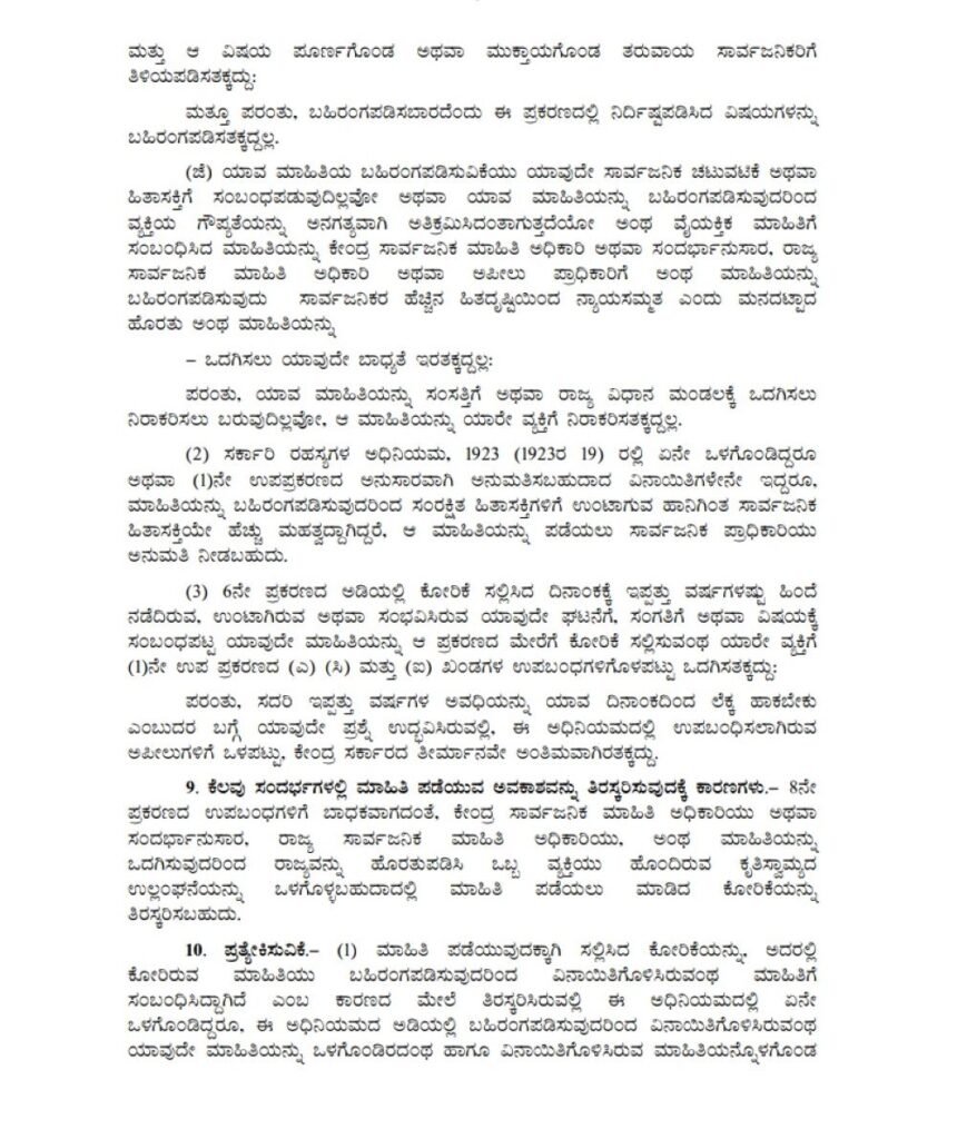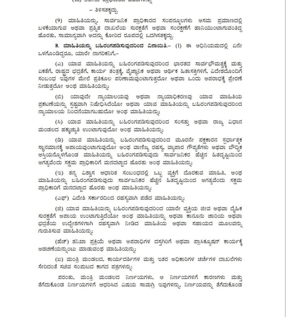 ಇನ್ನು, ತನಿಖಾ ಪ್ರಕ್ರಿಯೆ ಅಥವಾ ಅಪರಾಧಿಗಳ ದಸ್ತಗಿರಿಗೆ ಅಥವಾ ಪ್ರಾಸಿಕ್ಯೂಷನ್ ಕಾರ್ಯಕ್ಕೆ ಅಡಚಣೆಯನ್ನುಂಟು ಮಾಡುವಂಥ ಮಾಹಿತಿಯನ್ನು, ಮಂತ್ರಿಮಂಡಲದ, ಕಾರ್ಯದರ್ಶಿಗಳ ಮತ್ತು ಇತರ ಅಧಿಕಾರಿಗಳ ಚರ್ಚೆಗಳ ದಾಖಲೆಗಳು ಸೇರಿದಂತೆ ಸಚಿವ ಸಂಪುಟದ ಕಾಗದ ಪತ್ರಗಳನ್ನು, ಮಂತ್ರಿ ಮಂಡಳದ ನಿರ್ಣಯಗಳು, ಆ ನಿರ್ಣಯಗಳಿಗೆ ಕಾರಣಗಳು ಮತ್ತು ತೆಗೆದುಕೊಂಡ ನಿರ್ಣಯಗಳಿಗೆ ಆಧರಿಸಿದ ವಿಷಯ ಸಾಮಗ್ರಿ ಇವುಗಳನ್ನು ನಿರ್ಣಯ ತೆಗೆದುಕೊಂಡ ಮತ್ತು ಆ ವಿಷಯ ಪೂರ್ಣಗೊಂಡ ಅಥವಾ ಮುಕ್ತಾಯಗೊಂಡ ತರುವಾ ಸಾರ್ವಜನಿಕರಿಗೆ ತಿಳಿಯಪಡಿಸತಕ್ಕದ್ದು, ಮತ್ತೂ ಪರಂತು, ಬಹಿರಂಗಪಡಿಸಬಾರದೆಂದು ಈ ಪ್ರಕರಣದಲ್ಲಿ ನಿರ್ದಿಷ್ಟಪಡಿಸಿದ ವಿಷಯಗಳನ್ನು ಬಹಿರಂಗಪಡಿಸತಕ್ಕದ್ದಲ್ಲಎಂದು ಕಾಯ್ದೆ ಹೇಳಿದೆ.