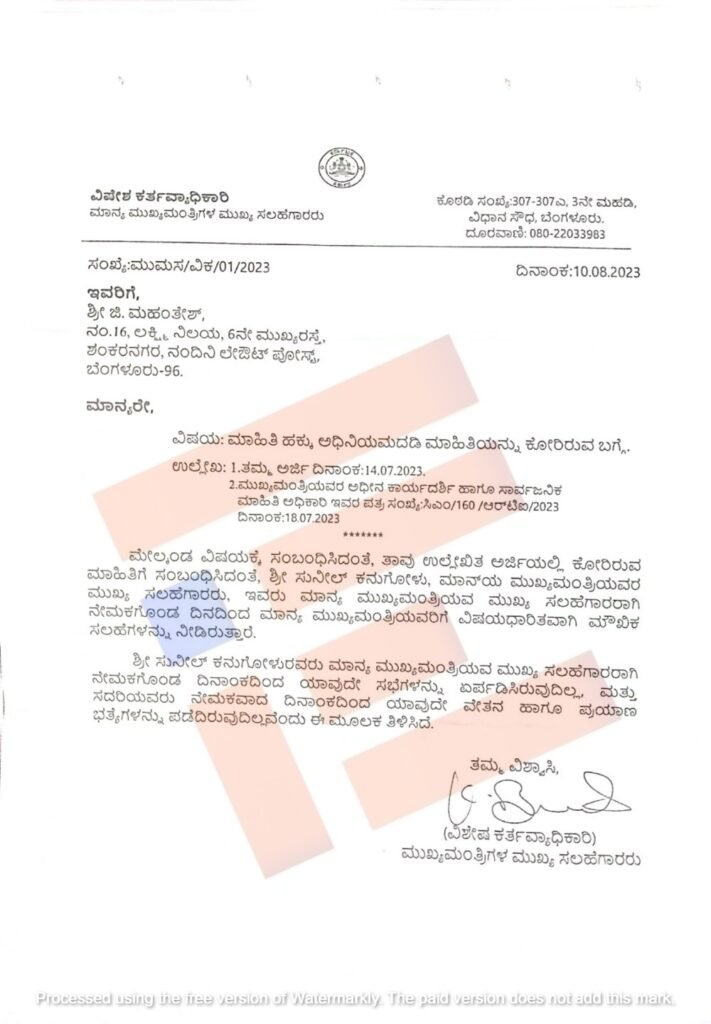 ಮುಖ್ಯಮಂತ್ರಿಯವರಿಗೆ ಮುಖ್ಯ ಸಲಹೆಗಾರರಾಗಿ ನೇಮಕವಾದ ದಿನದಿಂದ ಇದುವರೆಗೂ ನೀಡಿರುವ ಸಲಹೆಗಳ ವಿವರ, ಪ್ರಯಾಣ ಭತ್ಯೆ, ವೇತನ ಪಡೆದಿರುವ ಬಗ್ಗೆ ‘ದಿ ಫೈಲ್’ ಆರ್ಟಿಐ ಅಡಿಯಲ್ಲಿ ಮಾಹಿತಿ ಕೋರಿ ಸಲ್ಲಿಸಿದ್ದ ಅರ್ಜಿಗೆ ಉತ್ತರಿಸಿರುವ ಮುಖ್ಯಮಂತ್ರಿಗಳ ಮುಖ್ಯ ಸಲಹೆಗಾರರ ಕಚೇರಿಯ ವಿಶೇಷ ಕರ್ತವ್ಯಾಧಿಕಾರಿ ಸುನೀಲ್ ಕನುಗೋಳು ಅವರು ವಿಷಯಾಧರಿತವಾಗಿ ಮೌಖಿಕ ಸಲಹೆ ನೀಡಿರುತ್ತಾರೆ ಎಂದು ಮಾಹಿತಿ ಒದಗಿಸಿದ್ದಾರೆ.