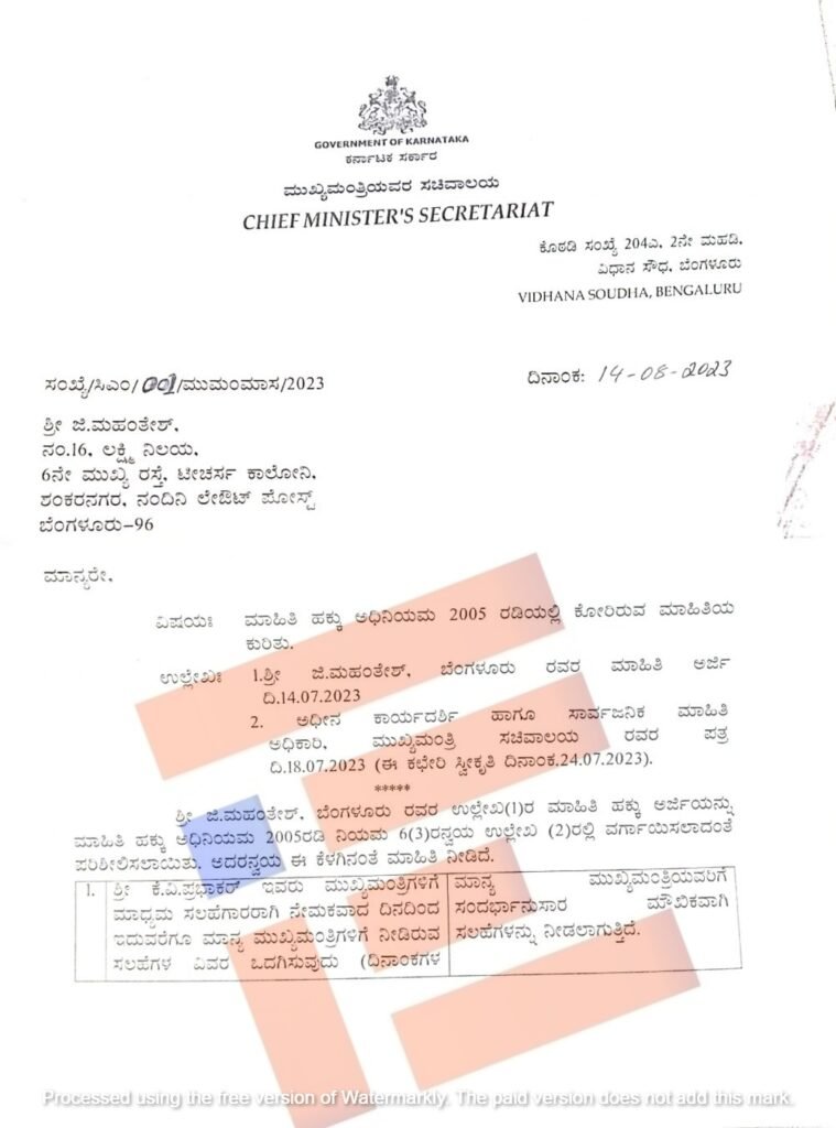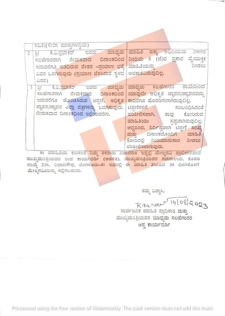ಹಾಗೆಯೇ ಕೆ ವಿ ಪ್ರಭಾಕರ್ ಅವರು ನೇಮಕವಾದ ದಿನಾಂಕದಿಂದ ಇದುವರೆಗೂ ಹೊರಡಿಸಿರುವ ಟಿಪ್ಪಣಿ, ಅಧಿಕೃತ ಜ್ಞಾಪನ, ಜ್ಞಾಪನ ಸೇರಿದಂತೆ ಎಲ್ಲಾ ಪತ್ರಗಳನ್ನು ಒದಗಿಸಬೇಕು ಎಂದ ನಿರ್ದಿಷ್ಟವಾಗಿ ಮಾಹಿತಿ ಕೋರಿದ್ದರೂ ಸಹ ಈ ಮಾಹಿತಿಯು ಸ್ಪಷ್ಟವಾಗಿಲ್ಲ ಮತ್ತು ನಿರ್ದಿಷ್ಟವಾಗಿಲ್ಲ ಎಂದು ಮಾಹಿತಿ ಒದಗಿಸಿದ್ದಾರೆ.