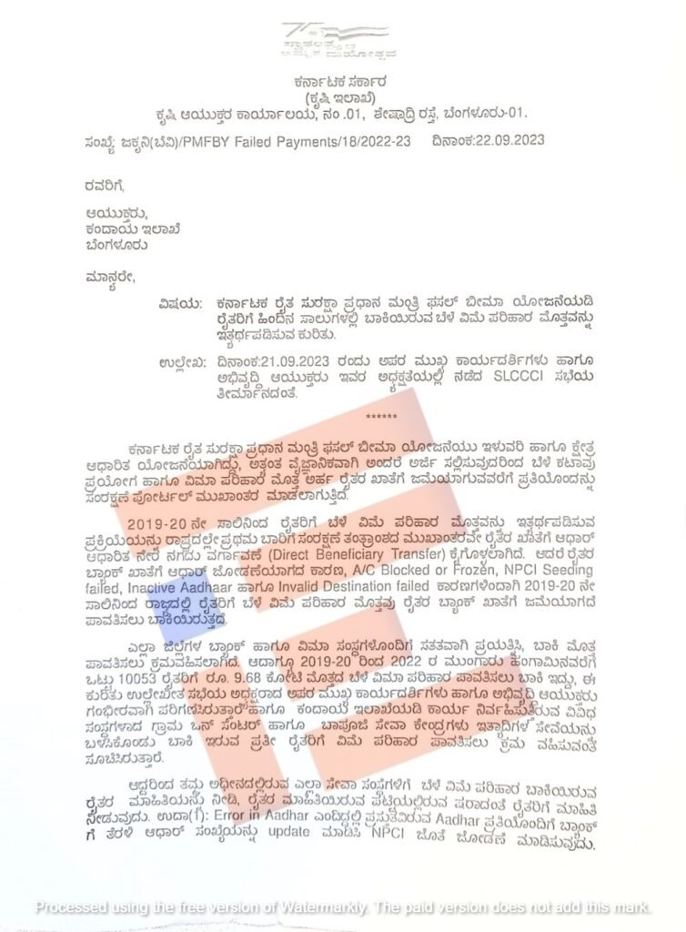 ಬೆಳೆ ವಿಮೆ ಪರಿಹಾರ ಮೊತ್ತ ಪಾವತಿ ಸಂಬಂಧ ಕೃಷಿ ಇಲಾಖೆ ಆಯುಕ್ತ ವೈ ಎಸ್‌ ಪಾಟೀಲ್‌ ಅವರು 2023ರ ಸೆ.22ರಂದು ಕಂದಾಯ ಇಲಾಖೆ ಆಯುಕ್ತರಿಗೆ ಪತ್ರವೊಂದನ್ನು ಬರೆದಿದ್ದಾರೆ. ಈ ಪತ್ರದ ಪ್ರತಿಯು ‘ದಿ ಫೈಲ್‌’ಗೆ ಲಭ್ಯವಾಗಿದೆ.