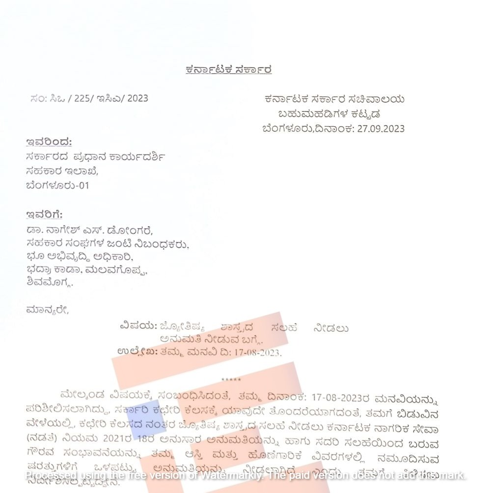 ಜ್ಯೋತಿಷ್ಯ ಶಾಸ್ತ್ರದ ಸಲಹೆ ನೀಡುವ ಸಂಬಂಧ ಡಾ ನಾಗೇಶ್‌ ಎಸ್‌ ಡೋಂಗರೆ ಅವರು ಅನುಮತಿ ಕೋರಿ ಸರ್ಕಾರಕ್ಕೆ 2023ರ ಆಗಸ್ಟ್‌ 17ರಂದು ಮನವಿ ಸಲ್ಲಿಸಿದ್ದರು. ಈ ಮನವಿಯನ್ನು ಪರಿಶೀಲಿಸಿದ್ದ ಸಹಕಾರ ಇಲಾಖೆಯು ಜ್ಯೋತಿಷ್ಯ ಶಾಸ್ತ್ರದ ಸಲಹೆ ನೀಡಲು ಅನುಮತಿ ನೀಡಿ (ಸಂ; ಸಿ ಒ / 225/ಇಸಿಎ/2023) ಪತ್ರ ಬರೆದಿದೆ. ಇದಕ್ಕೆ ಸಚಿವ ಕೆ ಎನ್‌ ರಾಜಣ್ಣ ಅವರೂ ಸಹ ಅನುಮೋದಿಸಿದ್ದಾರೆ ಎಂದು ತಿಳಿದು ಬಂದಿದೆ.
