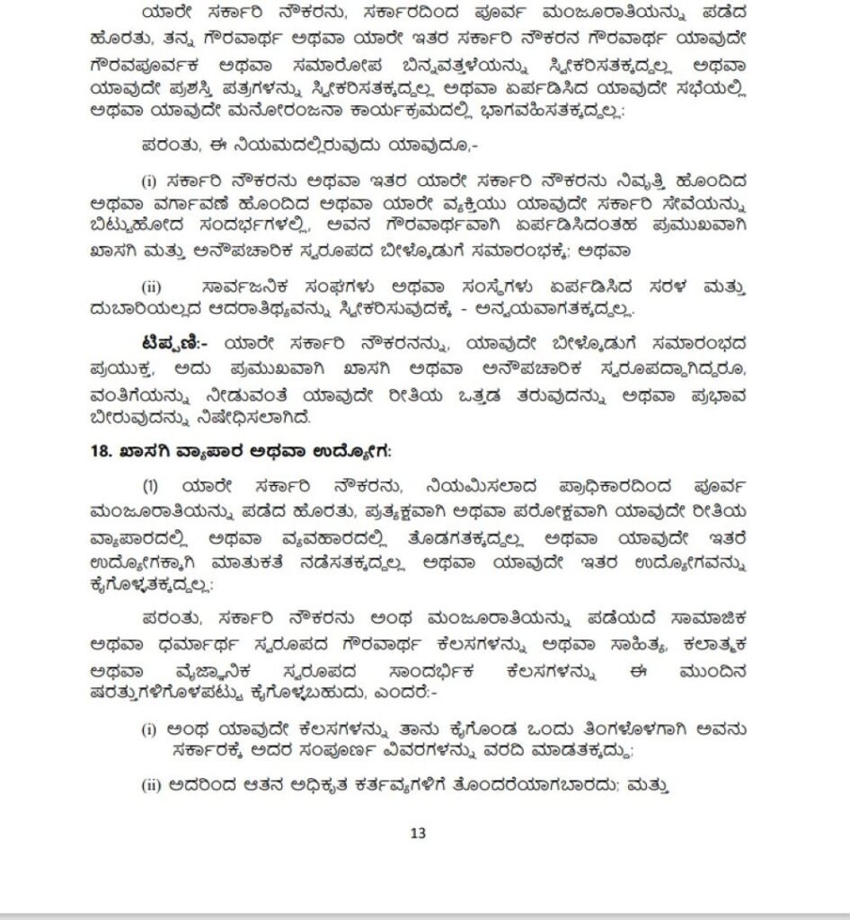 ಯಾರೇ ಸರ್ಕಾರಿ ನೌಕರನು, ನಿಯಮಿಸಲಾದ ಪ್ರಾಧಿಕಾರದಿಂದ ಪೂರ್ವ ಮಂಜೂರಾತಿಯನ್ನು ಪಡೆದ ಹೊರತು, ಪ್ರತ್ಯಕ್ಷವಾಗಿ ಅಥವಾ ಪರೋಕ್ಷವಾಗಿ ಯಾವುದೇ ರೀತಿಯ ವ್ಯಾಪಾರದಲ್ಲಿ ಅಥವಾ ವ್ಯವಹಾರದಲ್ಲಿ ತೊಡಗತಕ್ಕದ್ದಲ್ಲ ಅಥವಾ ಯಾವುದೇ ಇತರೆ ಉದ್ಯೋಗಕ್ಕಾಗಿ ಮಾತುಕತೆ ನಡೆಸಬಾರದು. ಅಥವಾ ಯಾವುದೇ ಇತರೆ ಉದ್ಯೋಗ ಕೈಗೊಳ್ಳಬಾರದು.