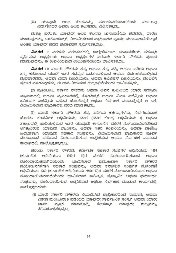 ಯಾವುದೇ ಅಂಥ ಕೆಲಸವು ಚುನಾವಣೀಯ ಪದವನ್ನು ಧಾರಣ ಮಾಡುವುದನ್ನು ಒಳಗೊಂಡಿದ್ದರೇ ಅಥವಾ ನಿಯಮಿಸಲಾದ ಪ್ರಾಧಿಕಾರದ ಪೂರ್ವ ಮಂಜೂರಾತಿಯಿಲ್ಲದೇ ಅಂತಹ ಯಾವುದೇ ಪದದ ಚುನಾವಣೆಗೆ ಸ್ಪರ್ಧಿಸಬಾರದು.