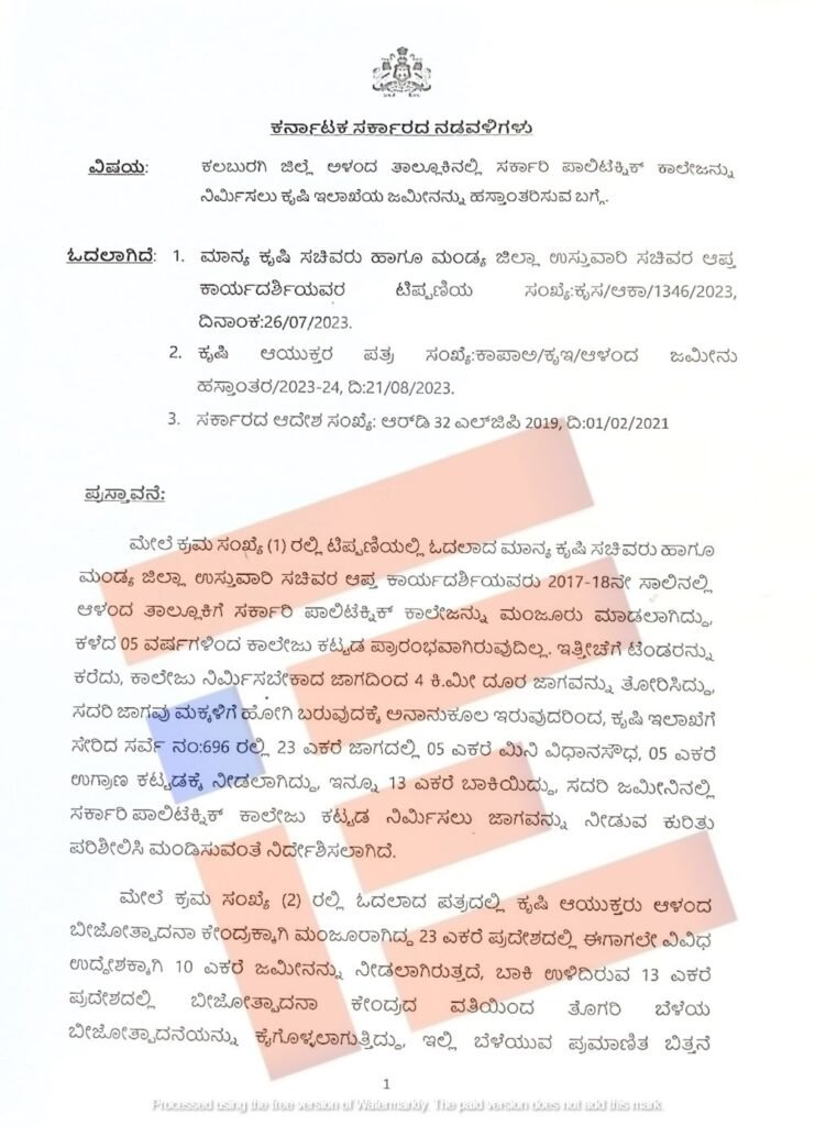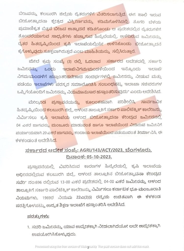 ಕೃಷಿ ಇಲಾಖೆಗೆ ಸೇರಿದ ಜಮೀನಿನ ಪೈಕಿ 4 ಎಕರೆ ವಿಸ್ತೀರ್ಣ ಜಮೀನನ್ನು ಉನ್ನತ ಶಿಕ್ಷಣ ಇಲಾಖೆಗೆ ಹಸ್ತಾಂತರಿಸಲು 2023ರ ಅಕ್ಟೋಬರ್‍‌ 5ರಂದು ಆದೇಶ ಹೊರಡಿಸಿದ್ದಾರೆ. ಇದರ ಪ್ರತಿಯು ‘ದಿ ಫೈಲ್‌’ಗೆ ಲಭ್ಯವಾಗಿದೆ.