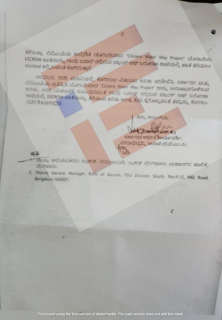 ಸಿಟಿಜನ್ ವಾಟರ್ ವೇ ಯೋಜನೆಗೆ ಸಂಬಂಧಿಸಿದಂತೆ ಎಸ್ಕ್ರೋ ಖಾತೆಯನ್ನು ಬೆಂಗಳೂರು ನಗರದ ಗಾಂಧಿ ಬಜಾರ್ನಲ್ಲಿರುವ ಬ್ಯಾಂಕ್ ಆಫ್ ಬರೋಡಾ ಶಾಖೆಯಲ್ಲಿ ತೆರೆಯಲು ಕ್ರಮಕೈಗೊಳ್ಳಬೇಕು ಎಂದು ನಗರಾಭಿವೃದ್ಧಿ ಇಲಾಖೆಯ ಸರ್ಕಾರದ ಹೆಚ್ಚುವರಿ ಮುಖ್ಯ ಕಾರ್ಯದರ್ಶಿ ರಾಕೇಶ್ ಸಿಂಗ್ ಅವರು ಬಿಬಿಎಂಪಿ ಮುಖ್ಯ ಆಯುಕ್ತ ತುಷಾರ್ ಗಿರಿನಾಥ್ ಅವರಿಗೆ 2021ರ ಜುಲೈ 16ರಂದು ಪತ್ರ ಬರೆದಿದ್ದರು. ಈ ಪತ್ರದ ಪ್ರತಿಯು ‘ದಿ ಫೈಲ್’ಗೆ ಲಭ್ಯವಾಗಿದೆ.