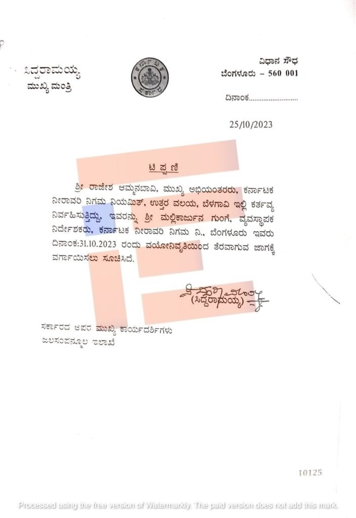 ಈ ಪತ್ರವನ್ನಾಧರಿಸಿ ರಾಜೇಶ್ ಅಮ್ಮಿನಬಾವಿ ಅವರನ್ನೇ ನಿಗಮದ ವ್ಯವಸ್ಥಾಪಕ ನಿರ್ದೇಶಕರ ಹುದ್ದೆಗೆ ವರ್ಗಾಯಿಸಬೇಕು ಎಂದು ಮುಖ್ಯಮಂತ್ರಿ ಸಿದ್ದರಾಮಯ್ಯ ಅವರು 2023ರ ಅಕ್ಟೋಬರ್ 25ರಂದು ಜಲಸಂಪನ್ಮೂಲ ಇಲಾಖೆಯ ಸರ್ಕಾರದ ಹೆಚ್ಚುವರಿ ಮುಖ್ಯ ಕಾರ್ಯದರ್ಶಿಗೆ ಟಿಪ್ಪಣಿ ಹಾಕಿದ್ದರು.