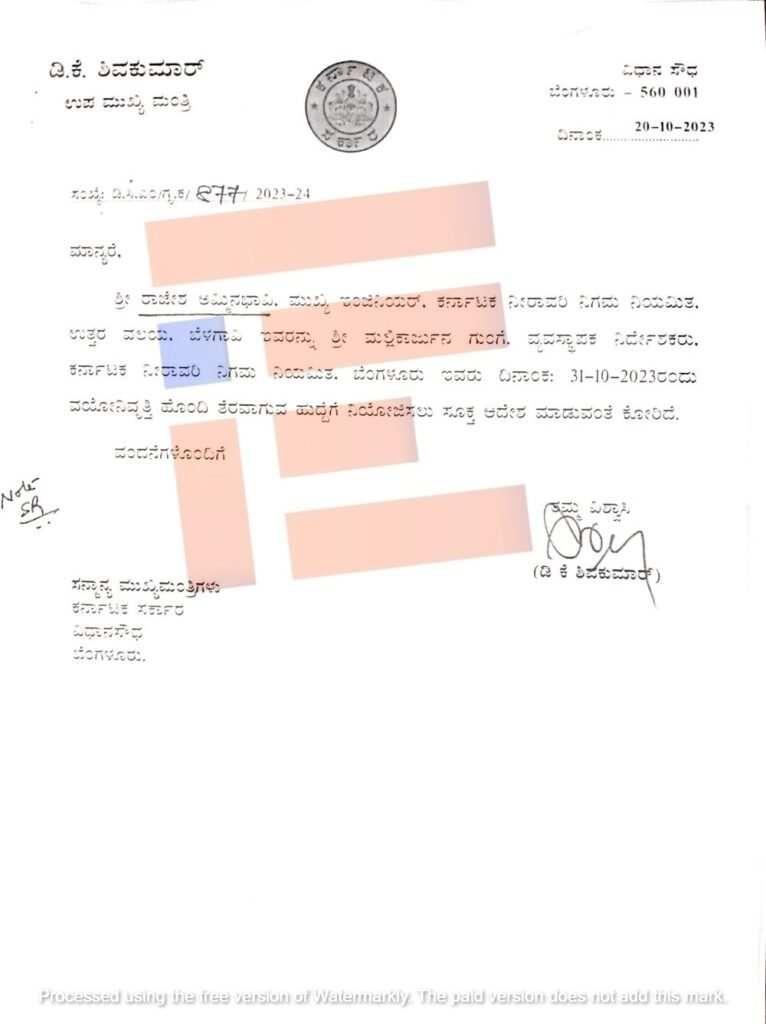 ರಾಜೇಶ್ ಅಮ್ಮಿನಬಾವಿ ಅವರನ್ನು ಕರ್ನಾಟಕ ನೀರಾವರಿ ನಿಗಮದ ವ್ಯವಸ್ಥಾಪಕ ನಿರ್ದೇಶಕರ ಹುದ್ದೆಗೆ ಶಿಫಾರಸ್ಸು ಮಾಡಿರುವ ಉಪ ಮುಖ್ಯಮಂತ್ರಿ ಹಾಗೂ ಜಲ ಸಂಪನ್ಮೂಲ ಸಚಿವ ಡಿ ಕೆ ಶಿವಕುಮಾರ್ ಅವರು ನೇರವಾಗಿ ಮುಖ್ಯಮಂತ್ರಿ ಸಿದ್ದರಾಮಯ್ಯ ಅವರಿಗೆ 2023ರ ಅಕ್ಟೋಬರ್ 20ರಂದು ಶಿಫಾರಸ್ಸು ಪತ್ರ ನೀಡಿದ್ದರು.