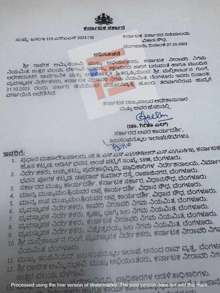 ಈ ಟಿಪ್ಪಣಿಯಲ್ಲಿನ ಸೂಚನೆಯನ್ನು ಜಲಸಂಪನ್ಮೂಲ ಇಲಾಖೆಯ ಸರ್ಕಾರದ ಹೆಚ್ಚುವರಿ ಮುಖ್ಯ ಕಾರ್ಯದರ್ಶಿ ರಾಕೇಶ್ ಸಿಂಗ್ ಅವರು ಯಥಾವತ್ತಾಗಿ ಪಾಲಿಸುವ ಮೂಲಕ ಸೇವಾ ಹಿರಿತನ ನಿಯಮಾವಳಿಗಳನ್ನು ಉಲ್ಲಂಘಿಸಿರುವ ಆರೋಪಕ್ಕೆ ಗುರಿಯಾಗಿದ್ದಾರೆ. ಇವರ ಸೂಚನೆ ಮೇರೆಗೆ ಜಲಸಂಪನ್ಮೂಲ ಇಲಾಖೆಯ ಸರ್ಕಾರದ ಜಂಟಿ ಕಾರ್ಯದರ್ಶಿ ಅವರು ರಾಜೇಶ್ ಅಮ್ಮಿನಬಾವಿ ಅವರನ್ನು ನಿಗಮದ ವ್ಯವಸ್ಥಾಪಕ ನಿರ್ದೇಶಕರನ್ನಾಗಿ ವರ್ಗಾಯಿಸಿ 2023ರ ಅಕ್ಟೋಬರ್ 27ರಂದು ಅಧಿಸೂಚನೆ ಹೊರಡಿಸಿದ್ದಾರೆ.