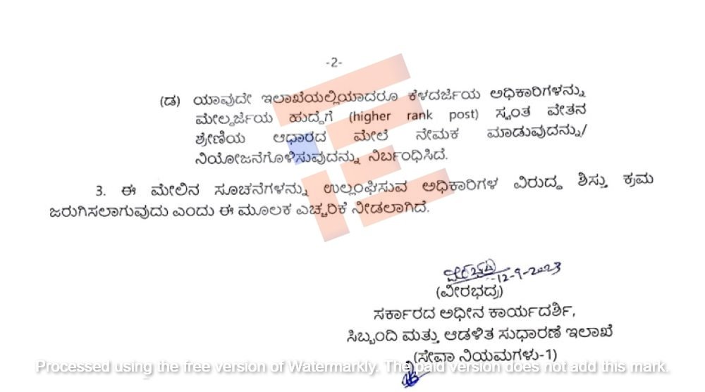 ಯಾವುದೇ ಇಲಾಖೆಯಲ್ಲಿಯಾದರೂ ಕೆಳ ದರ್ಜೆಯ ಅಧಿಕಾರಿಗಳನ್ನು ಮೇಲ್ದರ್ಜೆ ಹುದ್ದೆಗೆ ಸ್ವಂತ ವೇತನ ಶ್ರೇಣಿಯ ಆಧಾರದ ಮೇಲೆ ನೇಮಕ ಮಾಡುವುದನ್ನು ನಿಯೋಜನೆಗೊಳಿಸುವುದನ್ನು ನಿರ್ಬಂಧಿಸಿದೆ. ಈ ಮೇಲಿನ ಸೂಚನೆಯನ್ನು ಉಲ್ಲಂಘಿಸಿದ ಅಧಿಕಾರಿಗಳ ವಿರುದ್ಧ ಶಿಸ್ತು ಕ್ರಮ ಜರುಗಿಸಲಾಗುವುದು ಎಂದು ಸಿಬ್ಬಂದಿ ಮತ್ತು ಆಡಳಿತ ಇಲಾಖೆಯ ಸರ್ಕಾರದ ಅಧೀನ ಕಾರ್ಯದರ್ಶಿ ವೀರಭದ್ರ ಅವರು 2023ರ ಸೆ.12ರಂದೇ ಹೊರಡಿಸಿದ್ದ ಸುತ್ತೋಲೆಯಲ್ಲಿ ಎಚ್ಚರಿಕೆ ನೀಡಿದ್ದರು.