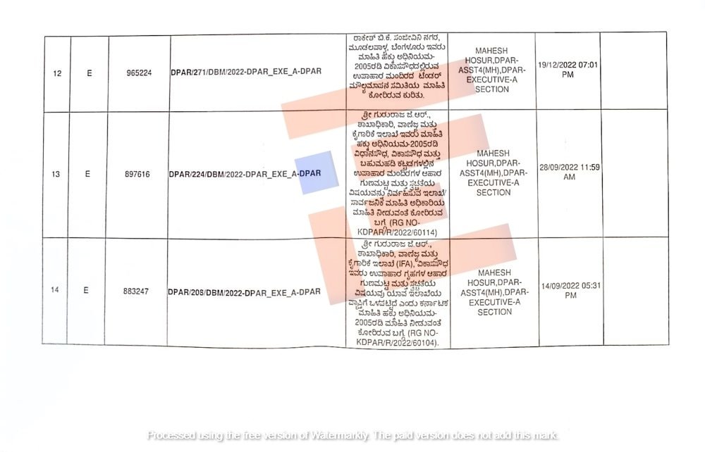 ಅದೇ ರೀತಿ ರಾಮಸ್ವಾಮಿ ಎಂಬುವರು ಸಚಿವಾಯದ ಕಚೇರಿಗಳಲ್ಲಿನ ಅನುಪಯುಕ್ತ ಕಾಗದ ವಿಲೇವಾರಿ ಕುರಿತು ಮತ್ತು ಕೈಗಾರಿಕೆ ಮತ್ತು ವಾಣಿಜ್ಯ ಇಲಾಖೆಯ ಶಾಖಾಧಿಕಾರಿ ಗುರುರಾಜ್ ಜೆ ಆರ್ ಎಂಬುವರು ವಿಧಾನಸೌಧ, ವಿಕಾಸ ಸೌಧ, ಬಹುಮಹಡಿ ಕಟ್ಟಡದಲ್ಲಿರುವ ಉಪಹಾರ ಮಂದಿರಗಳ ಆಹಾರ ಗುಣಮಟ್ಟ ಮತ್ತು ಸ್ವಚ್ಛತೆಯ ವಿಷಯವನ್ನು ನಿರ್ವಹಿಸುವ ಇಲಾಖೆ/ಸಾರ್ವಜನಿಕ ಮಾಹಿತಿ ಅಧಿಕಾರಿಯ ಮಾಹಿತಿಯನ್ನು ನೀಡುವಂತೆ ಕೋರಿದ್ದರು ಎಂಬುದು ಪಟ್ಟಿಯಿಂದ ಗೊತ್ತಾಗಿದೆ.