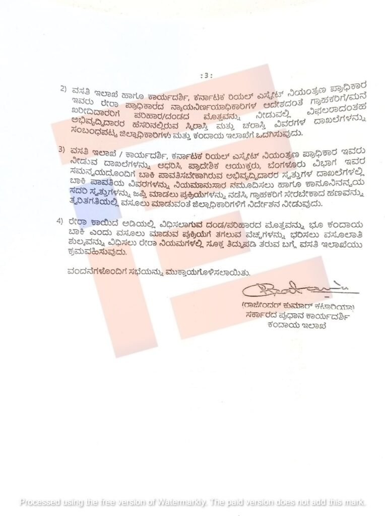ಅಲ್ಲದೇ ರೇರಾ ಕಾಯ್ದೆ ಅಡಿಯಲ್ಲಿ ವಿಧಿಸಲಾಗುವ ದಂಡ, ಪರಿಹಾರದ ಮೊತ್ತವನ್ನು ಭೂ ಕಂದಾಯ ಬಾಕಿ ಎಂದು ವಸೂಲು ಮಾಡುವ ಪ್ರಕ್ರಿಯೆಗೆ ತಗುಲುವ ವೆಚ್ಚಗಳನ್ನು ಭರಿಸಲು ಮತ್ತು ವಸೂಲಾತಿ ಶುಲ್ಕಗಳನ್ನು ವಿಧಿಸಲು ರೇರಾ ನಿಯಮಗಳಲ್ಲಿ ಸೂಕ್ತ ತಿದ್ದುಪಡಿ ತರುವ ಬಗ್ಗೆ ವಸತಿ ಇಲಾಖೆಯು ಕ್ರಮ ವಹಿಸಬೇಕು ಎಂದು ಸಭೆಯಲ್ಲಿ ಸೂಚಿಸಿರುವುದು ತಿಳಿದು ಬಂದಿದೆ.