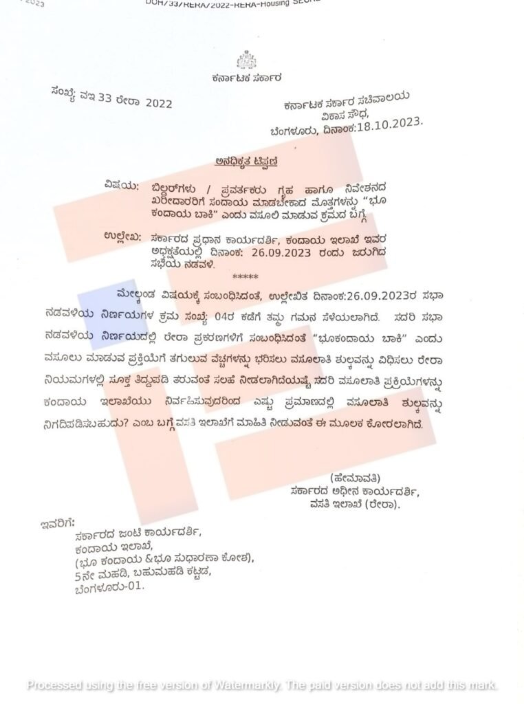 ಈ ಬೆಳವಣಿಗೆ ನಡುವೆಯೇ ಎಷ್ಟು ಪ್ರಮಾಣದಲ್ಲಿ ವಸೂಲಾತಿ ಶುಲ್ಕವನ್ನು ನಿಗದಿಪಡಿಸಬಹುದು ಎಂದು ಮಾಹಿತಿ ನೀಡಬೇಕು ಎಂದು ಕಂದಾಯ ಇಲಾಖೆಗೆ ವಸತಿ ಇಲಾಖೆಯು ಸೂಚಿಸಿದೆ. ಈ ಸಂಬಂಧ 20234 ಅಕ್ಟೋಬರ್‍‌ 18ರಂದು ಅನಧಿಕೃತ ಟಿಪ್ಪಣಿ ಹೊರಡಿಸಿದೆ. ಇದರ ಪ್ರತಿಯು ‘ದಿ ಫೈಲ್‌’ಗೆ ಲಭ್ಯವಾಗಿದೆ.