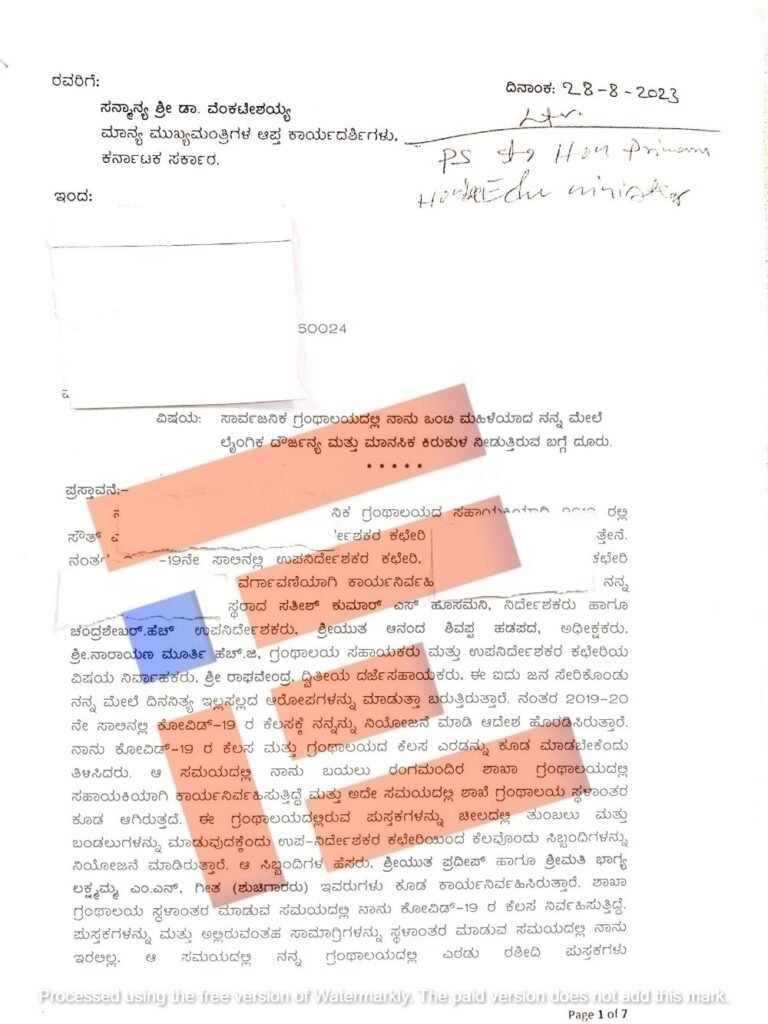 ತನ್ನ ಮೇಲಾಧಿಕಾರಿಯಾದ ರಾಜ್ಯ ಸಾರ್ವಜನಿಕ ಗ್ರಂಥಾಲಯ ಇಲಾಖೆ ನಿರ್ದೇಶಕ ಸತೀಶ್ ಕುಮಾರ್ ಎಸ್ ಹೊಸಮನಿ ಮತ್ತು ಇಲಾಖೆಯ ಇನ್ನಿತರೆ ಅಧಿಕಾರಿಗಳ ವಿರುದ್ಧ ಬೆಂಗಳೂರಿನ ಆರ್ ಟಿ ನಗರದಲ್ಲಿರುವ ಗ್ರಂಥಾಲಯ ಸಹಾಯಕಿಯೊಬ್ಬರು ಮುಖ್ಯಮಂತ್ರಿ ಸಿದ್ದರಾಮಯ್ಯ ಅವರ ಕಚೇರಿಗೆ ಲಿಖಿತವಾಗಿ 7 ಪುಟಗಳ ದೂರು ನೀಡಿದ್ದಾರೆ. ಈ ದೂರು, ಸಾರ್ವಜನಿಕ ಗ್ರಂಥಾಲಯದ ಇಲಾಖೆಯ ಮತ್ತೊಂದು ಮುಖವನ್ನು ತೆರೆದಿಟ್ಟಿದೆ.